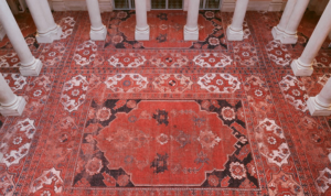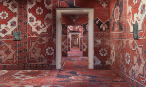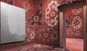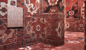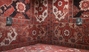 The exhibit touches on Sigmund Freud’s early 20th Century Viennese study with the exhibit of art suggesting presences that are ‘buried’ in memory, and removed experiences that thrive again. The carpet design itself replicates one of the carpets on the floor of Sigmund Freud’s study.