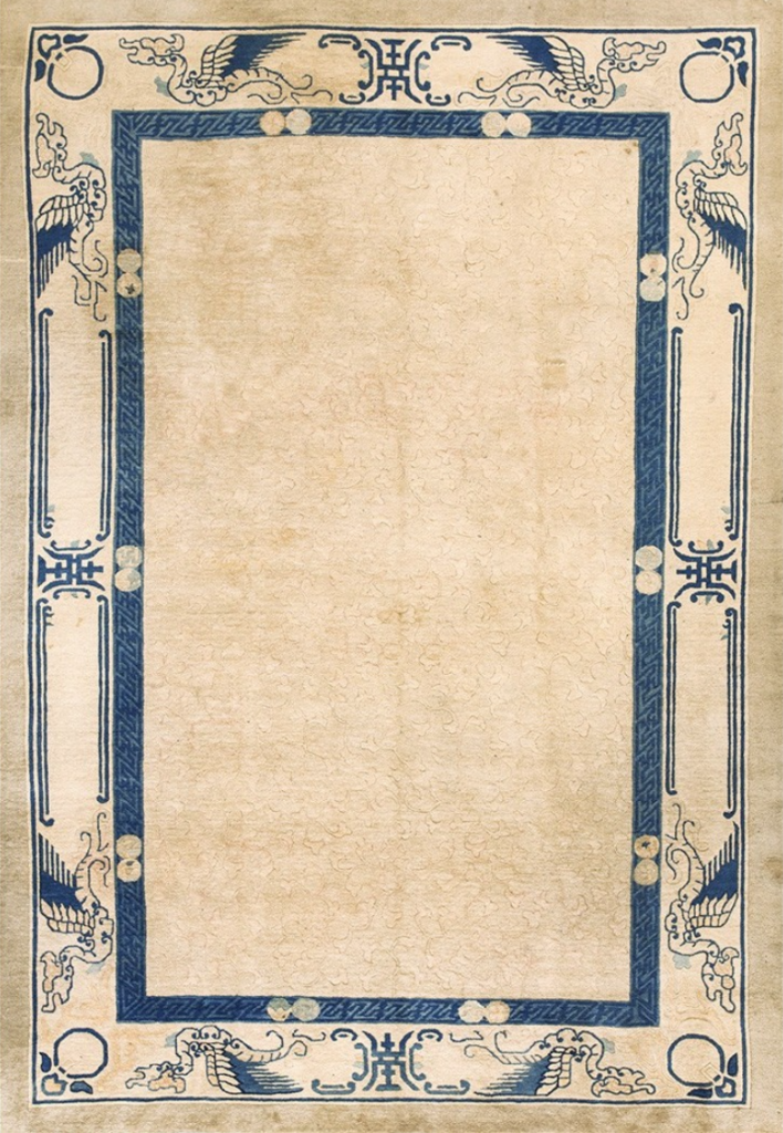The small scale, open, square form is popular on blue and white antique Chinese rugs either as a border or field pattern. The Fette-Li company in Peking in the interwar period employed many unique designs based on traditional Chinese textiles, bronzes, jades and ceramics, but, surprisingly did not make extensive use of the Shou symbol. For an exception see number 22975. Fette carpets resemble no others from the 1920-30’s yet they are still recognizably Chinese without being “Chinesey” or otherwise blatantly exotic.