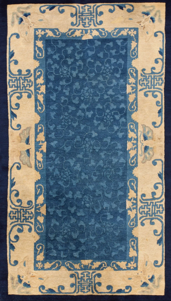 Antique Peking blue and white carpets have made liberal use of the Shou element in both field and border.