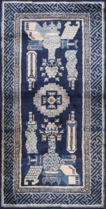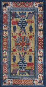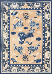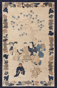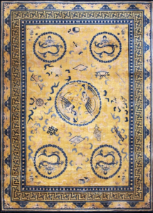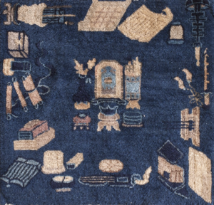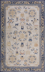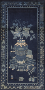 In the world of Chinese rugs we find a subgrouping in which seemingly inanimate objects are pictorially portrayed in a couple of ways. Wether these objects float around the field, or are visually arranged as a still life, it is clear that their continued usage over time pegs them as not inanimate, but rather objects of historical or cultural importance. These objects tell a story about history and tradition, and are symbols of cultural pride.