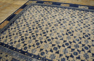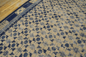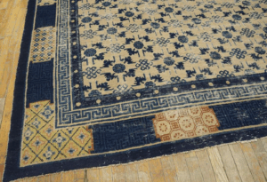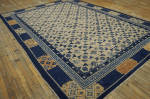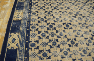 The verso on a quick look appears Ningxia, but a closer perusal reveals variations that sow doubts in the mind of the observer. Suiyuan might be a viable attribution. Although Suiyuan is best known for “grains of rice” patterned pieces in 4’ by 6’ or 5’ by 8’ sizes, there is no reason that a commissioned special order piece could not have been larger. A close comparison to other rugs usually assigned to Suiyuan would be useful here.