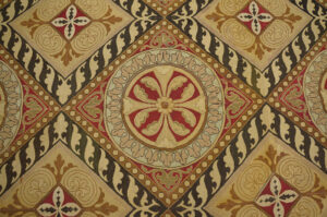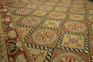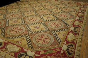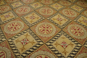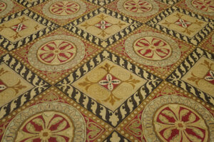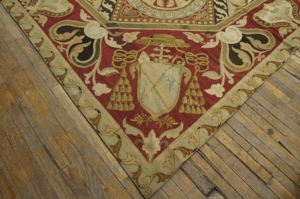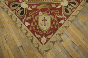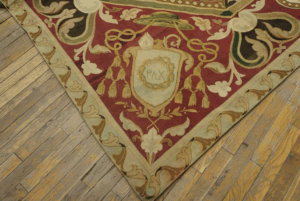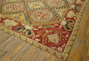 This mosaic floor pattern wool needlepoint carpet was clearly a special commission for a high-level Roman Catholic ecclesiastic, bishop and then archbishop / cardinal as indicated by the hats with tassels in the corners. Each of these corners surmount a shield of arms, one of which displays the cross, another with a wreath bearing the inscription ‘pax’ or ‘peace’, and the other two more distinctly armorial, probably indicating the cleric’s family name. The more tassels, the higher level the churchman. Monsignors have the fewest tassels, archbishops at the cardinal level the most. The archbishop/cardinal’s arms show a double-armed Cross of Lorraine surmounting a shield with a bend. Another armorial shield shows a bend with a small lion beneath, and at the top an azure band with star and crescent ornamentation. The Lorraine Cross may (or may not) indicate service in the capital city of Nancy. Regardless, the original patron should, with further research, be identifiable. The shields indicate a patron of noble birth, as was the usual practice in the Catholic Church in France and Italy in the 19th century. It was probably woven for a large reception room in the archiepiscopal palace of an important French city.