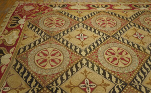 The pattern is a four-column row alternation of broad slate lozenges and narrow red dotted lozenges – the former with small, flowing detached leaf patterns. The enclosed motives are either acanthus fringed circles with leafy crossed petals within smaller circles, or small diamonds with slender marigold leaf extensions. There are small heart-shaped ivy leaf extenders at four points of the circles. The field corners are beveled to accommodate the hats and shields. The deep oxblood border shows an alternation of heart-shaped acanthus volutes, some with dark brown filling, some border-toned, with different cordiform motives with dot décor and lily filling. The whole look is very 19th century and there is only the very slightest Arts and Crafts (or the French equivalent) influence in the border. The other secondary hues include straw, sand, green, red, and brown. The drawing is flat and two-dimensional except for the corner hats.