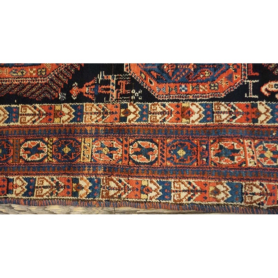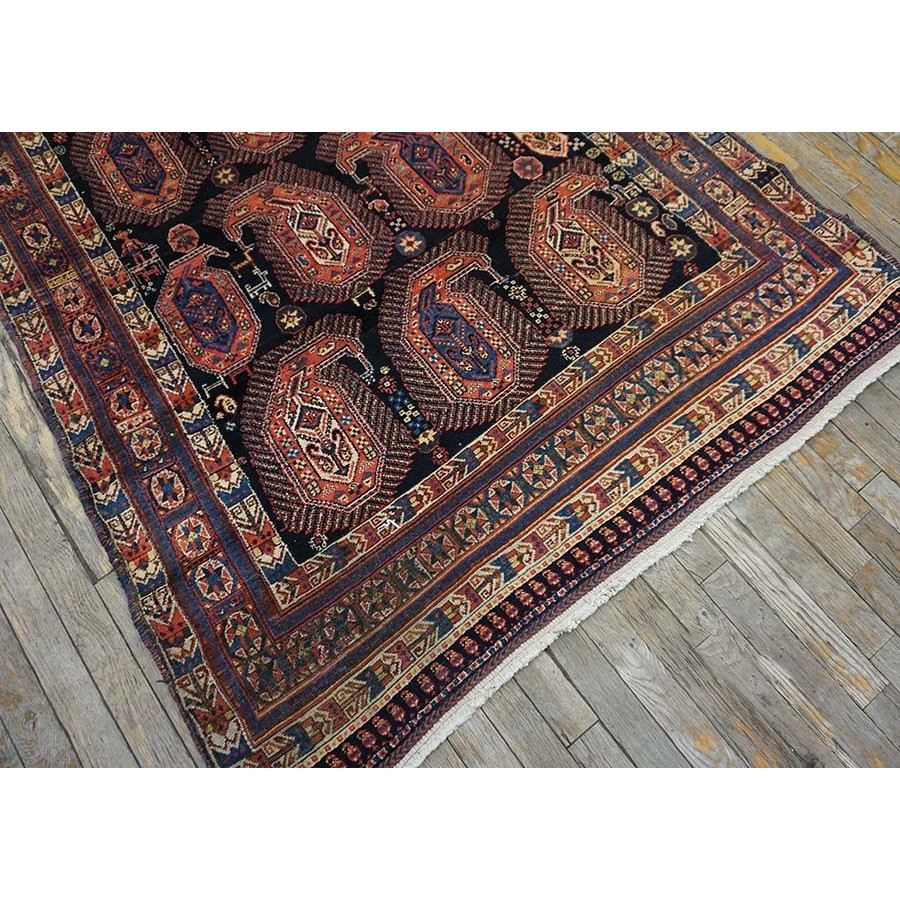 Botehs of all sizes fill the navy blue field of this c.1900 antique rug,. but especially giant fringed cones facing left and right. A few small animals add to the rustic informality of this carpet. The inner and outer ivory borders with geometric flowers are an Afshar touch.