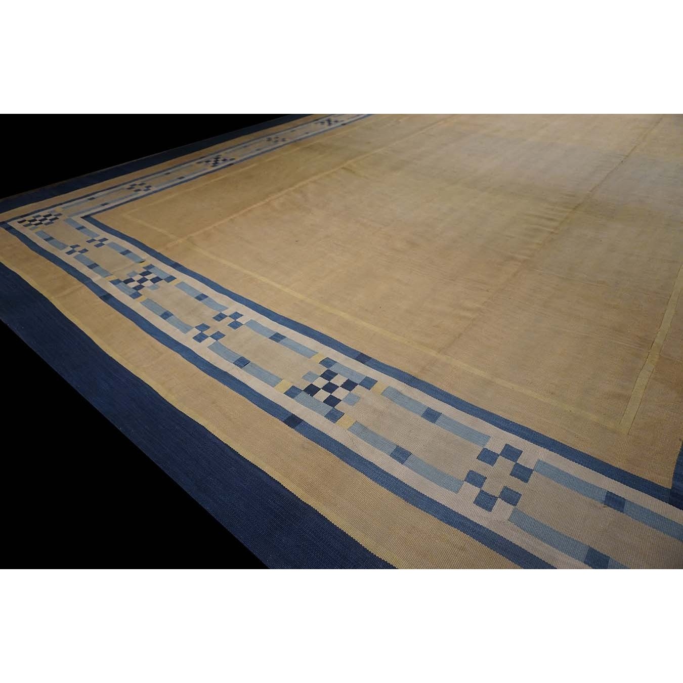 Open, unornamented field were popular in the Art Deco period. This enormous, camel- colored carpet may have been initially woven for an exclusive hotel lobby. The ivory border is ornamented with dots and bars in shades of blue. A grand gallery or perhaps a return to institutional use would be equally appropriate. The condition is still excellent, without spot or channel wear, amazingly after more than 80 years