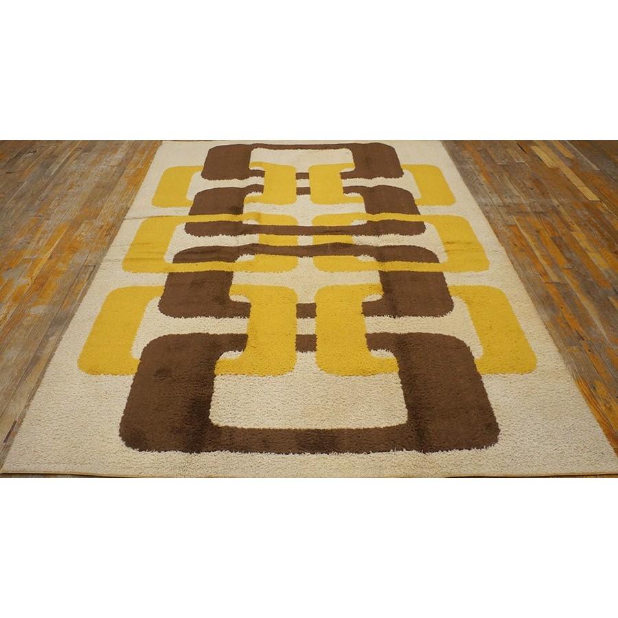 Danish Modern furniture requires Danish Modern rugs like this one to maximally achieve the desired unified effect. The ivory field of this border less,wholly abstract rug has nine interlocking bold, squared ovals in yellow and brown. The scale of the rug is greater than the actual size and it is the emphatic center of any room.
