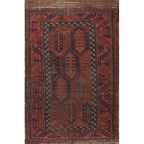 DescriptionBaluchA name given to (mostly) pile rugs woven by Indo-European Tribal groups in Easter Iran (Khorossana nd Sistan Provinces) and Northwest Afghanistan (Herat Prov.). The true Baluch tribes of Baluchistan do not weave pile rugs of excellent wool, the sizes tend to be small, up to 5 x 7, with a few older large carpets. The tones are dark blues, camel, reds and purples with white accents. In older pieces the colors are jewel-like and the texture is velvety. The tribes dwell in black goat-hair tents and migrate seasonally. Saddlebags, pillows, animal trappings and other small items are woven. Camelfield player rugs are particularly characteristic and desirable. Most examples are inexpensive, but a serious collector market exists for the best. | |