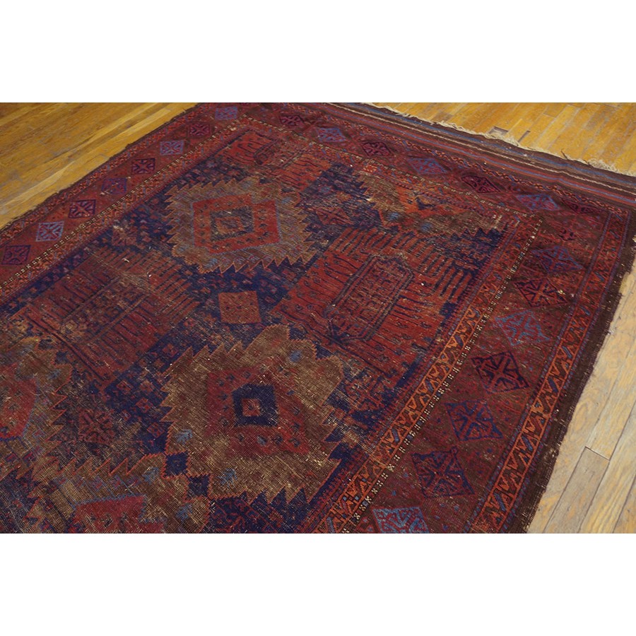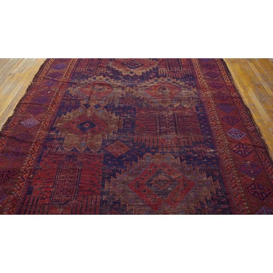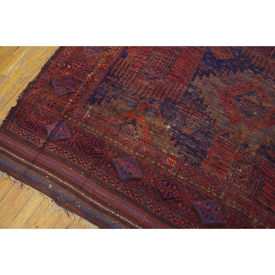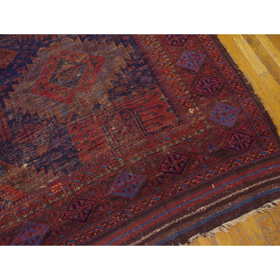 DescriptionBaluchA name given to (mostly) pile rugs woven by Indo-European Tribal groups in Easter Iran (Khorossana nd Sistan Provinces) and Northwest Afghanistan (Herat Prov.). The true Baluch tribes of Baluchistan do not weave pile rugs of excellent wool, the sizes tend to be small, up to 5 x 7, with a few older large carpets. The tones are dark blues, camel, reds and purples with white accents. In older pieces the colors are jewel-like and the texture is velvety. The tribes dwell in black goat-hair tents and migrate seasonally. Saddlebags, pillows, animal trappings and other small items are woven. Camelfield player rugs are particularly characteristic and desirable. Most examples are inexpensive, but a serious collector market exists for the best. | |