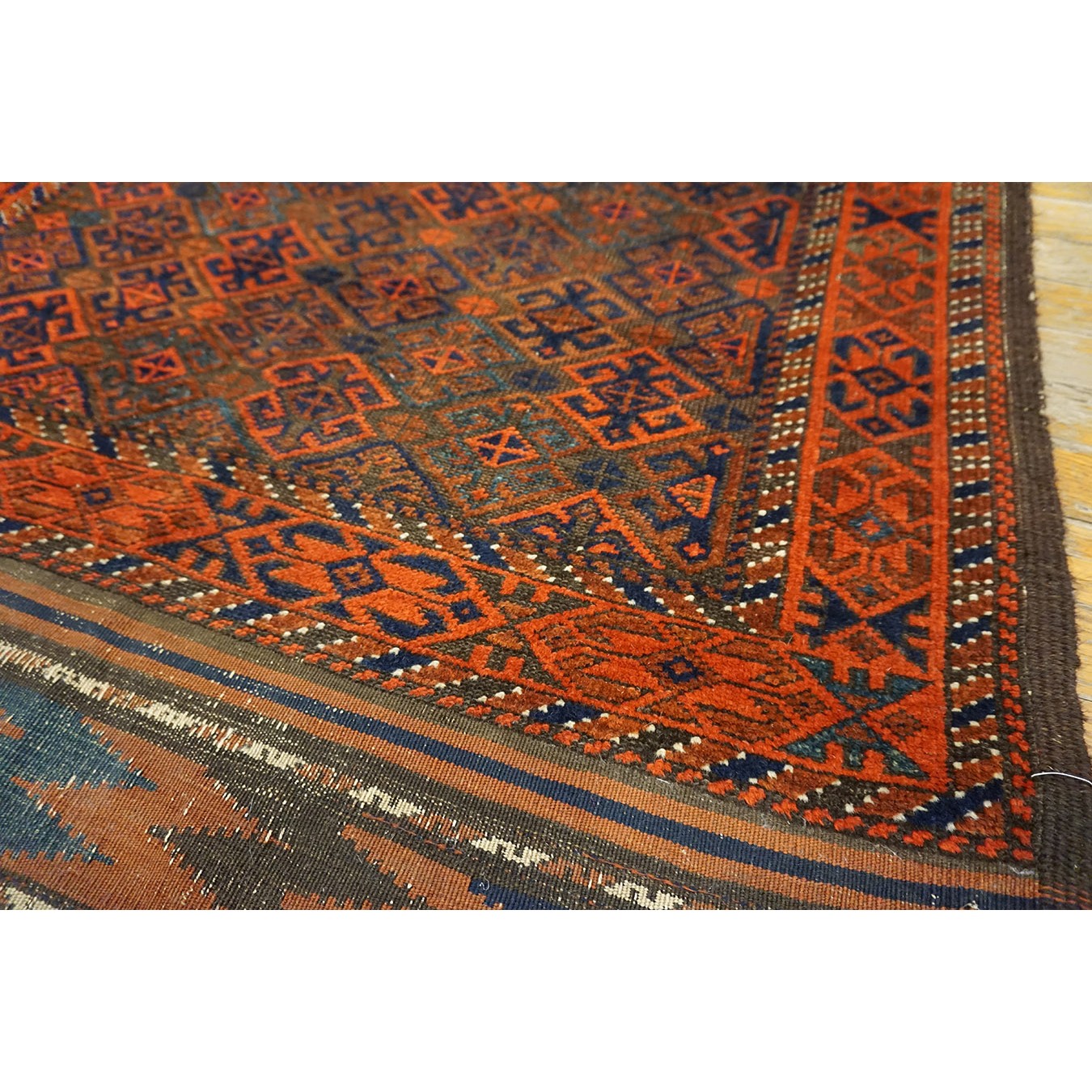 DescriptionBaluchA name given to (mostly) pile rugs woven by Indo-European Tribal groups in Easter Iran (Khorossana nd Sistan Provinces) and Northwest Afghanistan (Herat Prov.). The true Baluch tribes of Baluchistan do not weave pile rugs of excellent wool, the sizes tend to be small, up to 5 x 7, with a few older large carpets. The tones are dark blues, camel, reds and purples with white accents. In older pieces the colors are jewel-like and the texture is velvety. The tribes dwell in black goat-hair tents and migrate seasonally. Saddlebags, pillows, animal trappings and other small items are woven. Camelfield player rugs are particularly characteristic and desirable. Most examples are inexpensive, but a serious collector market exists for the best. | |