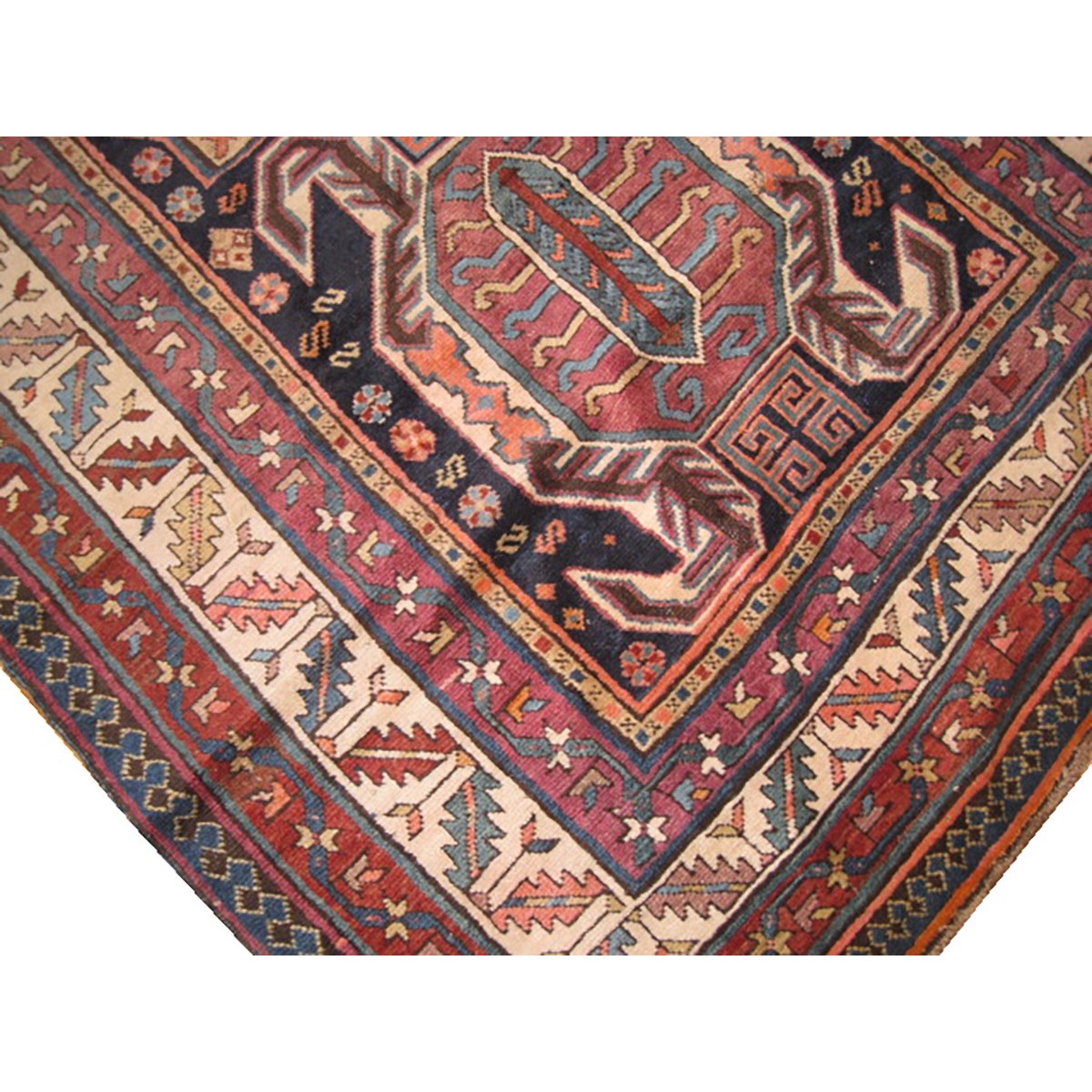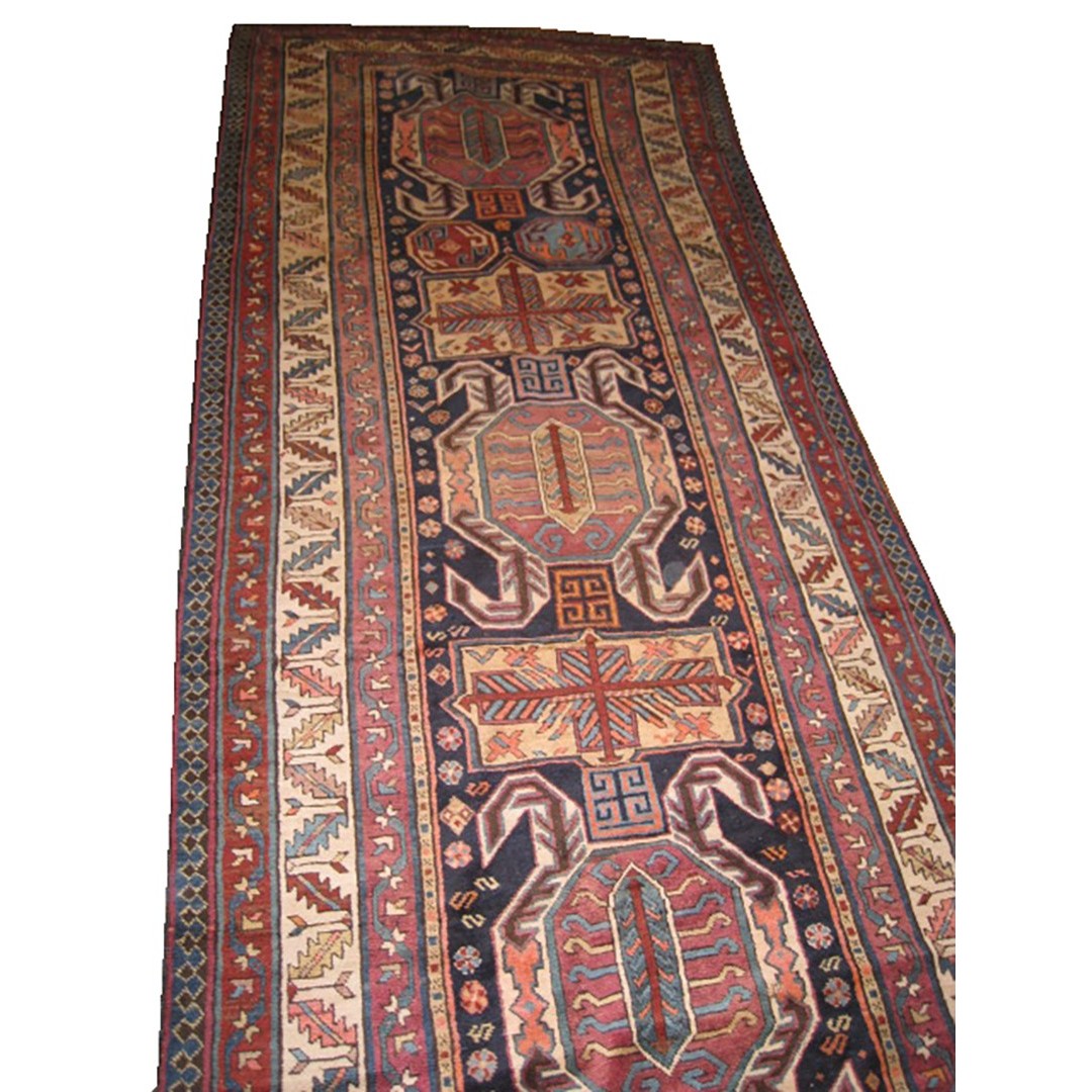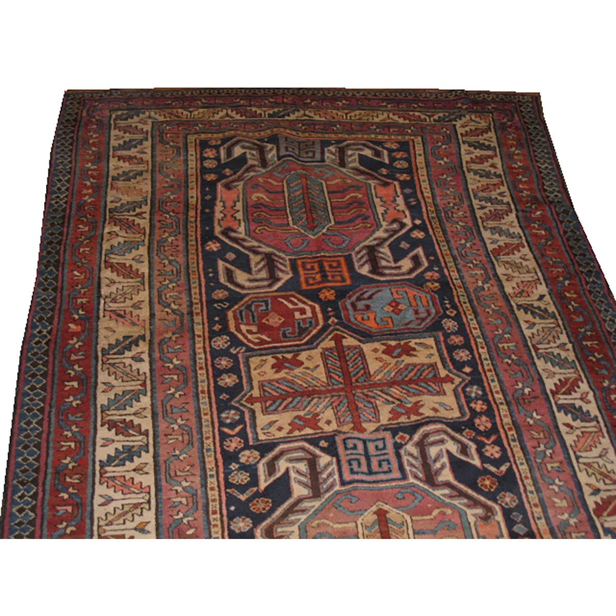 DescriptionCaucasianThis is the general heading for all rugs made in the Caucasus mountains and in the trans-Caucasus areas, north of the Arax River, and between the Black and Caspian Seas. This includes rugs from the Kazak, Karabagh, Gendje, Koghan, Talish, Akstafa, Shirvan, Baku, Kuba and hesghi districts and the variants and subtypes thereof. The rugs are usually in scatter sizes and of all wool construction, with bold colors and geometric patterns, from the 18th through 20th centuries. Prices range widely depending on rarity, color, design and condition. A strong collector market exists for the better examples. | |