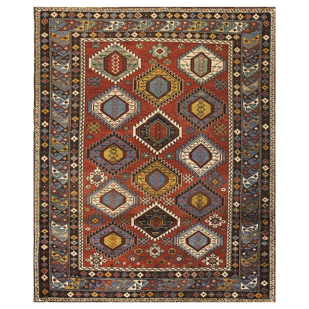 DescriptionCaucasianThis is the general heading for all rugs made in the Caucasus mountains and in the trans-Caucasus areas, north of the Arax River, and between the Black and Caspian Seas. This includes rugs from the Kazak, Karabagh, Gendje, Koghan, Talish, Akstafa, Shirvan, Baku, Kuba and hesghi districts and the variants and subtypes thereof. The rugs are usually in scatter sizes and of all wool construction, with bold colors and geometric patterns, from the 18th through 20th centuries. Prices range widely depending on rarity, color, design and condition. A strong collector market exists for the better examples. | |