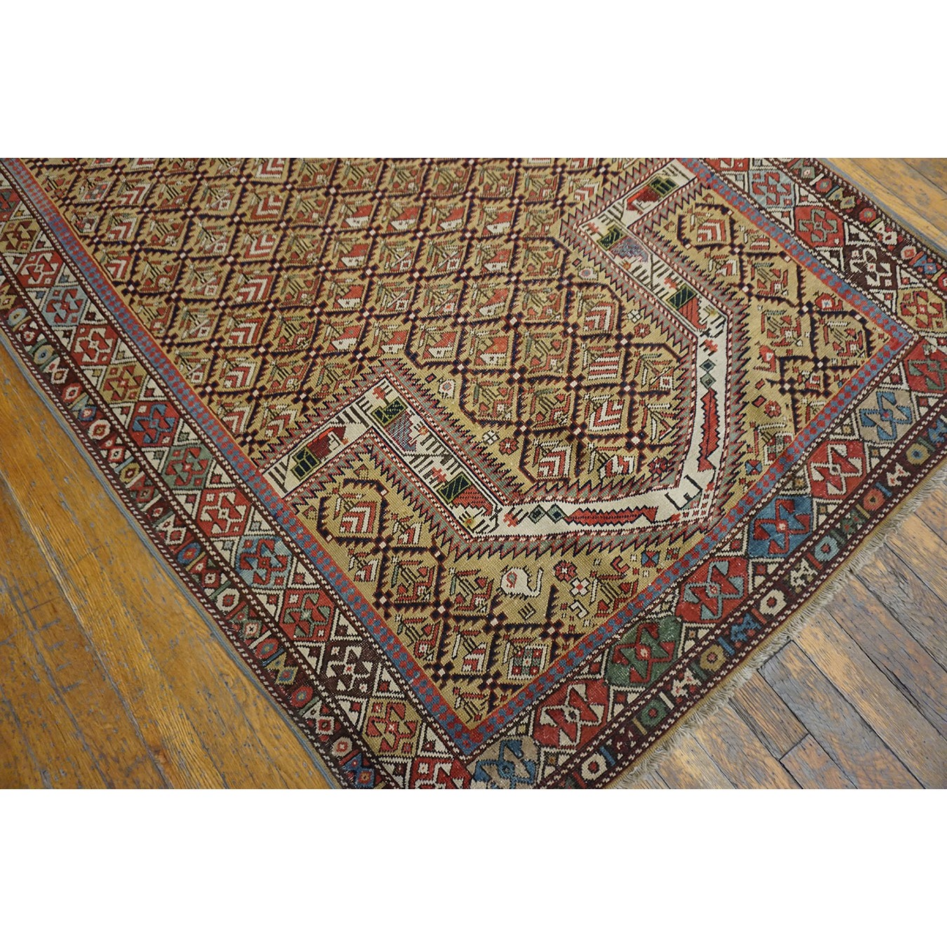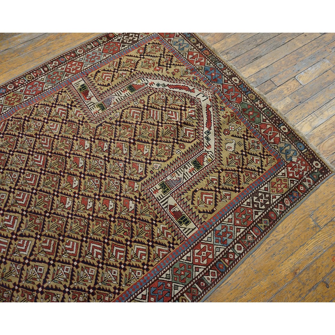 DescriptionCaucasianThis is the general heading for all rugs made in the Caucasus mountains and in the trans-Caucasus areas, north of the Arax River, and between the Black and Caspian Seas. This includes rugs from the Kazak, Karabagh, Gendje, Koghan, Talish, Akstafa, Shirvan, Baku, Kuba and hesghi districts and the variants and subtypes thereof. The rugs are usually in scatter sizes and of all wool construction, with bold colors and geometric patterns, from the 18th through 20th centuries. Prices range widely depending on rarity, color, design and condition. A strong collector market exists for the better examples. | |