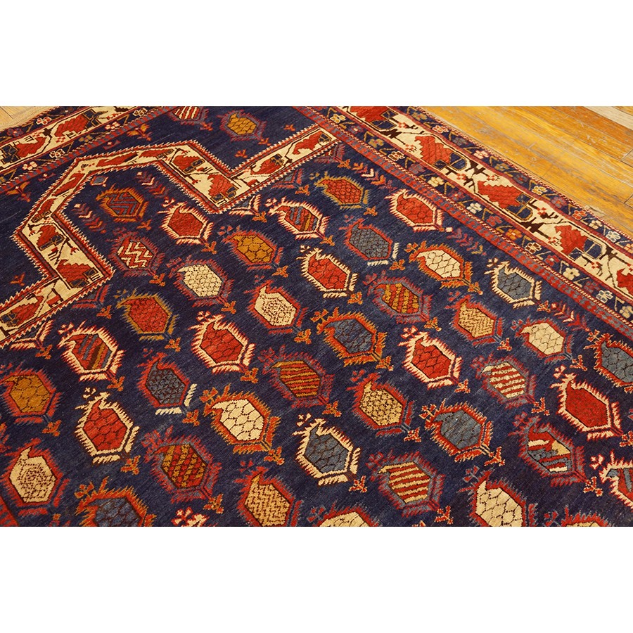 This is the general heading for all rugs made in the Caucasus mountains and in the trans-Caucasus areas, north of the Arax River, and between the Black and Caspian Seas. This includes rugs from the Kazak, Karabagh, Gendje, Koghan, Talish, Akstafa, Shirvan, Baku, Kuba and hesghi districts and the variants and subtypes thereof. The rugs are usually in scatter sizes and of all wool construction, with bold colors and geometric patterns, from the 18th through 20th centuries. Prices range widely depending on rarity, color, design and condition. A strong collector market exists for the better examples.