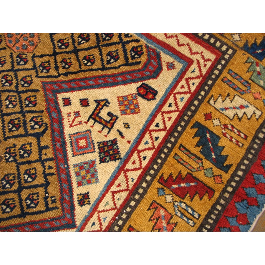 DescriptionCaucasianThis is the general heading for all rugs made in the Caucasus mountains and in the trans-Caucasus areas, north of the Arax River, and between the Black and Caspian Seas. This includes rugs from the Kazak, Karabagh, Gendje, Koghan, Talish, Akstafa, Shirvan, Baku, Kuba and hesghi districts and the variants and subtypes thereof. The rugs are usually in scatter sizes and of all wool construction, with bold colors and geometric patterns, from the 18th through 20th centuries. Prices range widely depending on rarity, color, design and condition. A strong collector market exists for the better examples. CaucasianThis is the general heading for all rugs made in the Caucasus mountains and in the trans-Caucasus areas, north of the Arax River, and between the Black and Caspian Seas. This includes rugs from the Kazak, Karabagh, Gendje, Koghan, Talish, Akstafa, Shirvan, Baku, Kuba and hesghi districts and the variants and subtypes thereof. The rugs are usually in scatter sizes and of all wool construction, with bold colors and geometric patterns, from the 18th through 20th centuries. Prices range widely depending on rarity, color, design and condition. A strong collector market exists for the better examples. | |