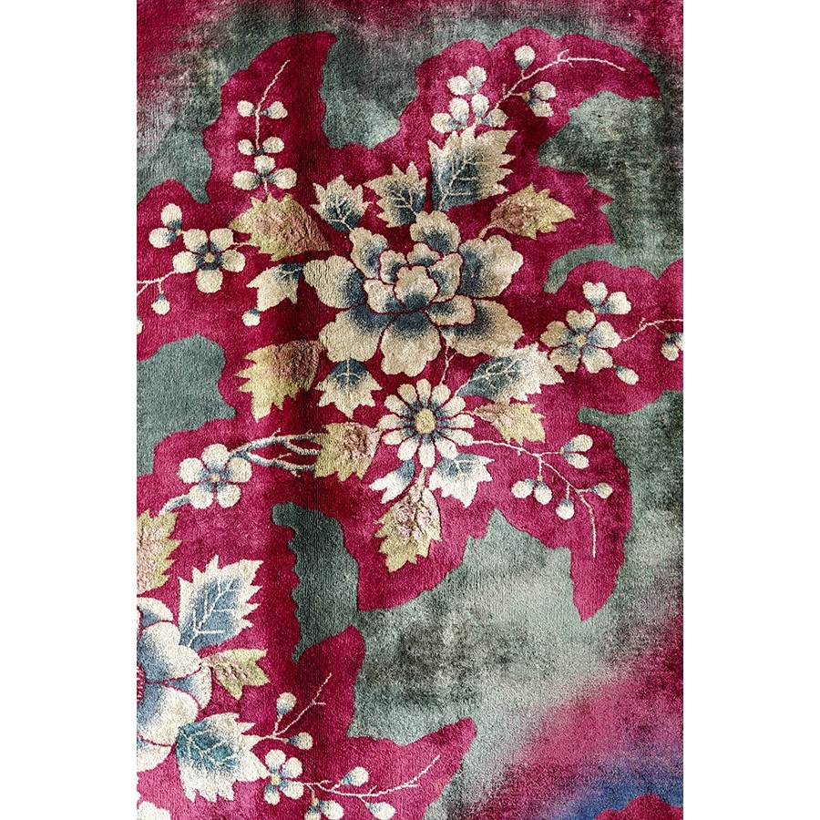 DescriptionChineseCarpets made in China proper. See entries Ningshia, Peking, Art Deco. Chinese - Art DecoAs the name implies, pieces woven between the wars for the Western market by mostly American owned firms especially Nichols and Fette, in thick heavy weaves using strong colors, asymmetric patterns and downplaying the Chinese-ness of the carpet. Nichols rugs are more strong toned than the pastel Fette. Most were woven in the coastal port city of Tientsin. Other lesser known workshops were also active. Some pieces are ultra-geometric and haute-Deco moderne in character: these are very rare. More frequent are pieces with bits of Chinese ornament: vases or other precious objects, paeonies, vines, fences, etc. Most common is the 9 x 12 size, in colors never found in mainstream Chinese rugs: backgrounds in black, mauve, purple, hot pink, orange, olive, employing the best synthetic chrome dyes of the period. Prices are still reasonable and carpets in top condition are available. | |
