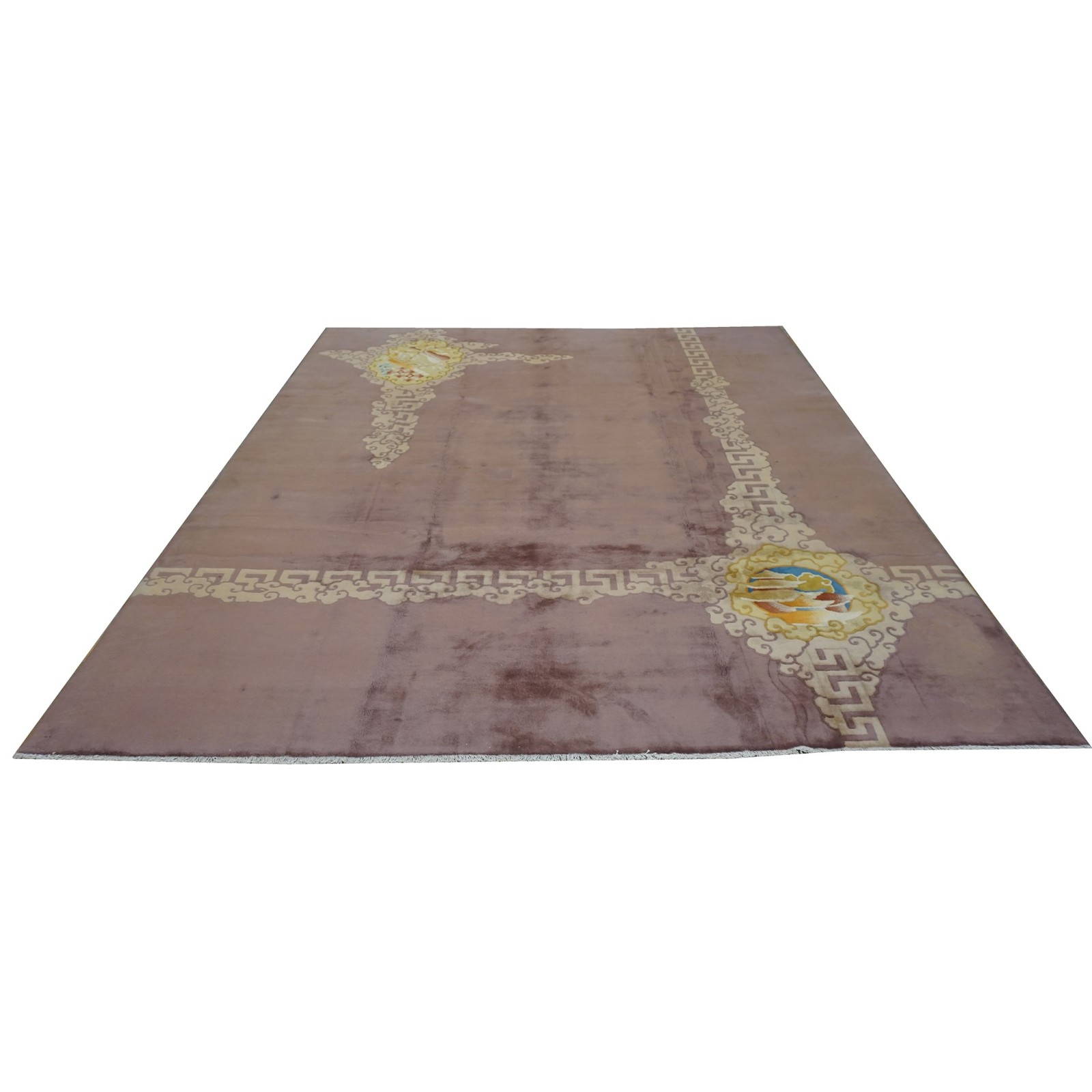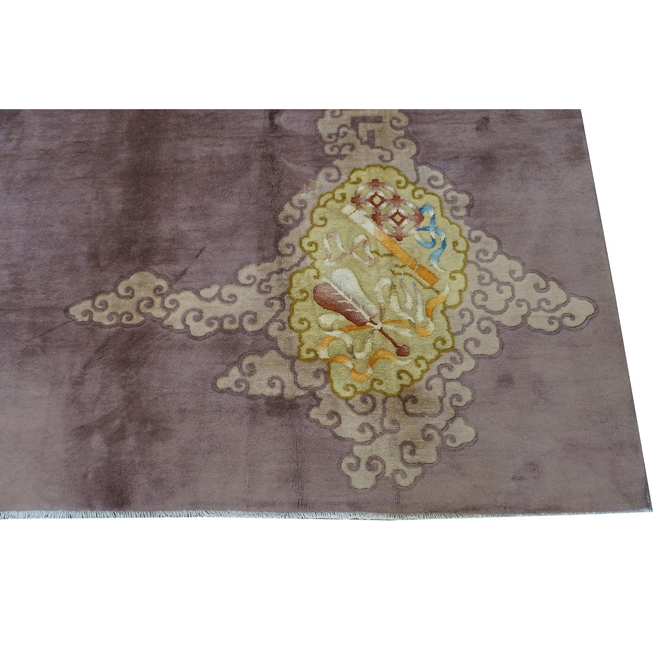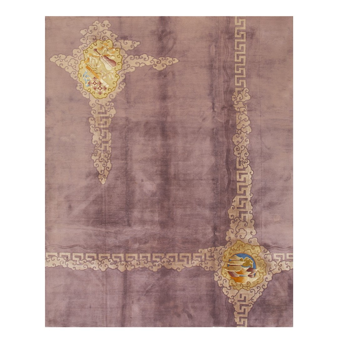 DescriptionChineseCarpets made in China proper. See entries Ningshia, Peking, Art Deco. Chinese - Art DecoAs the name implies, pieces woven between the wars for the Western market by mostly American owned firms especially Nichols and Fette, in thick heavy weaves using strong colors, asymmetric patterns and downplaying the Chinese-ness of the carpet. Nichols rugs are more strong toned than the pastel Fette. Most were woven in the coastal port city of Tientsin. Other lesser known workshops were also active. Some pieces are ultra-geometric and haute-Deco moderne in character: these are very rare. More frequent are pieces with bits of Chinese ornament: vases or other precious objects, paeonies, vines, fences, etc. Most common is the 9 x 12 size, in colors never found in mainstream Chinese rugs: backgrounds in black, mauve, purple, hot pink, orange, olive, employing the best synthetic chrome dyes of the period. Prices are still reasonable and carpets in top condition are available. | |