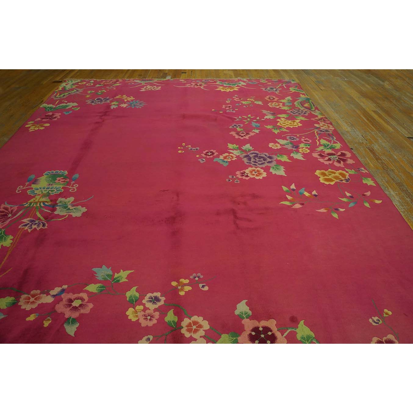 DescriptionChineseCarpets made in China proper. See entries Ningshia, Peking, Art Deco. Chinese - Art DecoAs the name implies, pieces woven between the wars for the Western market by mostly American owned firms especially Nichols and Fette, in thick heavy weaves using strong colors, asymmetric patterns and downplaying the Chinese-ness of the carpet. Nichols rugs are more strong toned than the pastel Fette. Most were woven in the coastal port city of Tientsin. Other lesser known workshops were also active. Some pieces are ultra-geometric and haute-Deco moderne in character: these are very rare. More frequent are pieces with bits of Chinese ornament: vases or other precious objects, paeonies, vines, fences, etc. Most common is the 9 x 12 size, in colors never found in mainstream Chinese rugs: backgrounds in black, mauve, purple, hot pink, orange, olive, employing the best synthetic chrome dyes of the period. Prices are still reasonable and carpets in top condition are available. | |