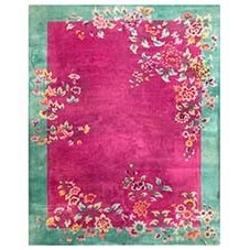 DescriptionChineseCarpets made in China proper. See entries Ningshia, Peking, Art Deco. Chinese - Art DecoAs the name implies, pieces woven between the wars for the Western market by mostly American owned firms especially Nichols and Fette, in thick heavy weaves using strong colors, asymmetric patterns and downplaying the Chinese-ness of the carpet. Nichols rugs are more strong toned than the pastel Fette. Most were woven in the coastal port city of Tientsin. Other lesser known workshops were also active. Some pieces are ultra-geometric and haute-Deco moderne in character: these are very rare. More frequent are pieces with bits of Chinese ornament: vases or other precious objects, paeonies, vines, fences, etc. Most common is the 9 x 12 size, in colors never found in mainstream Chinese rugs: backgrounds in black, mauve, purple, hot pink, orange, olive, employing the best synthetic chrome dyes of the period. Prices are still reasonable and carpets in top condition are available. | |