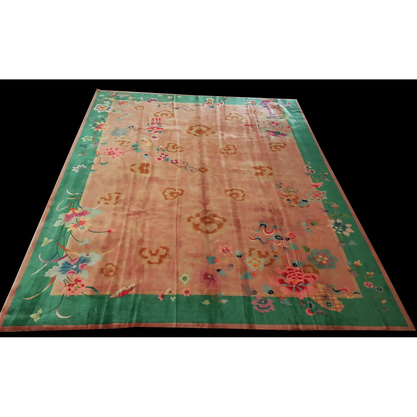 DescriptionChineseCarpets made in China proper. See entries Ningshia, Peking, Art Deco. Chinese - Art DecoAs the name implies, pieces woven between the wars for the Western market by mostly American owned firms especially Nichols and Fette, in thick heavy weaves using strong colors, asymmetric patterns and downplaying the Chinese-ness of the carpet. Nichols rugs are more strong toned than the pastel Fette. Most were woven in the coastal port city of Tientsin. Other lesser known workshops were also active. Some pieces are ultra-geometric and haute-Deco moderne in character: these are very rare. More frequent are pieces with bits of Chinese ornament: vases or other precious objects, paeonies, vines, fences, etc. Most common is the 9 x 12 size, in colors never found in mainstream Chinese rugs: backgrounds in black, mauve, purple, hot pink, orange, olive, employing the best synthetic chrome dyes of the period. Prices are still reasonable and carpets in top condition are available. | |