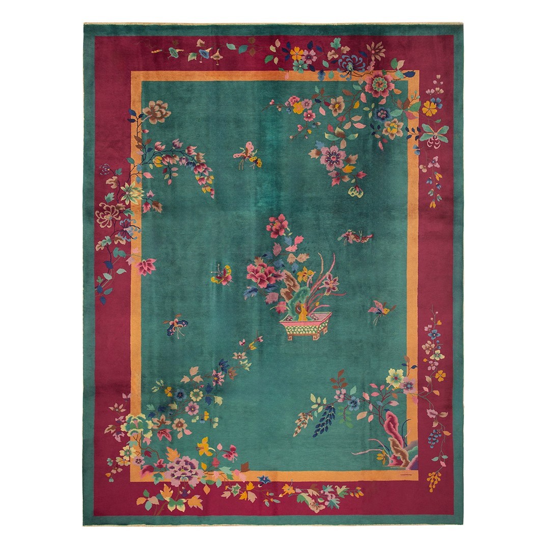 DescriptionChineseCarpets made in China proper. See entries Ningshia, Peking, Art Deco. Chinese - Art DecoAs the name implies, pieces woven between the wars for the Western market by mostly American owned firms especially Nichols and Fette, in thick heavy weaves using strong colors, asymmetric patterns and downplaying the Chinese-ness of the carpet. Nichols rugs are more strong toned than the pastel Fette. Most were woven in the coastal port city of Tientsin. Other lesser known workshops were also active. Some pieces are ultra-geometric and haute-Deco moderne in character: these are very rare. More frequent are pieces with bits of Chinese ornament: vases or other precious objects, paeonies, vines, fences, etc. Most common is the 9 x 12 size, in colors never found in mainstream Chinese rugs: backgrounds in black, mauve, purple, hot pink, orange, olive, employing the best synthetic chrome dyes of the period. Prices are still reasonable and carpets in top condition are available. | |