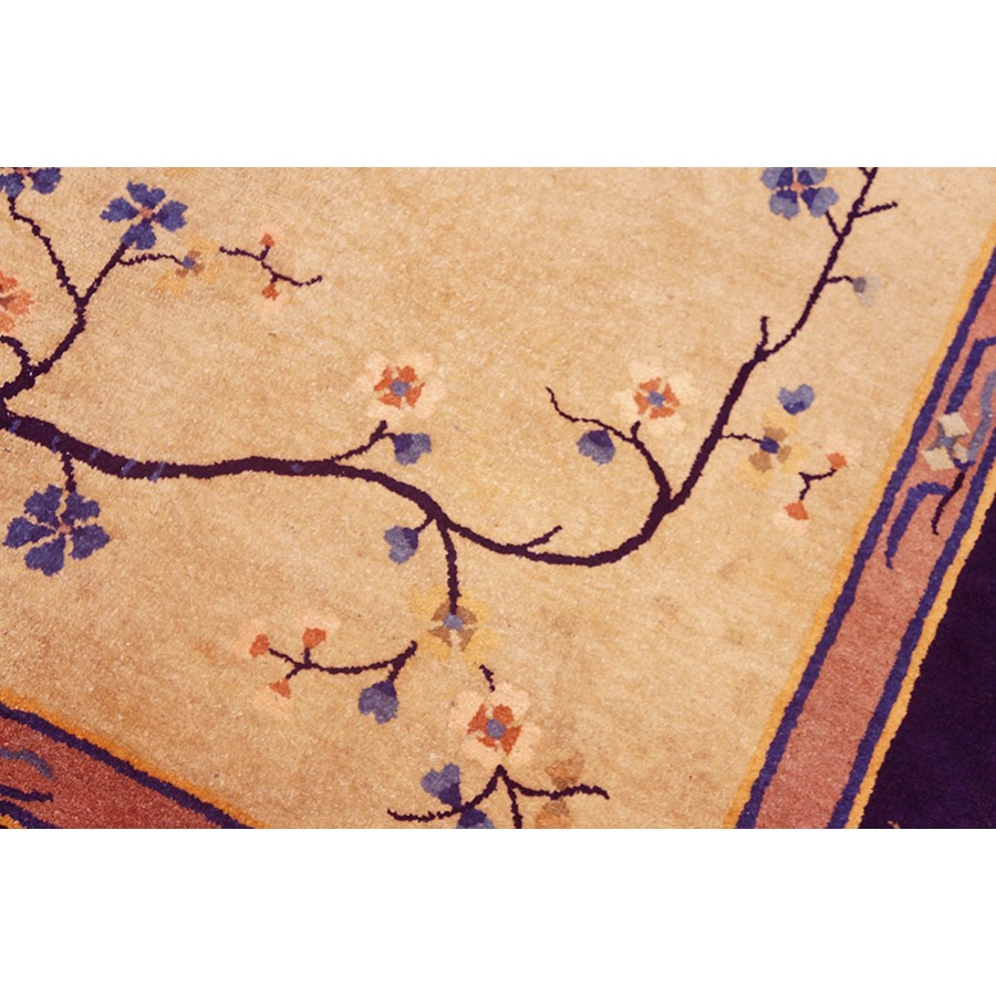 DescriptionChineseCarpets made in China proper. See entries Ningshia, Peking, Art Deco. Chinese - Art DecoAs the name implies, pieces woven between the wars for the Western market by mostly American owned firms especially Nichols and Fette, in thick heavy weaves using strong colors, asymmetric patterns and downplaying the Chinese-ness of the carpet. Nichols rugs are more strong toned than the pastel Fette. Most were woven in the coastal port city of Tientsin. Other lesser known workshops were also active. Some pieces are ultra-geometric and haute-Deco moderne in character: these are very rare. More frequent are pieces with bits of Chinese ornament: vases or other precious objects, paeonies, vines, fences, etc. Most common is the 9 x 12 size, in colors never found in mainstream Chinese rugs: backgrounds in black, mauve, purple, hot pink, orange, olive, employing the best synthetic chrome dyes of the period. Prices are still reasonable and carpets in top condition are available. | |