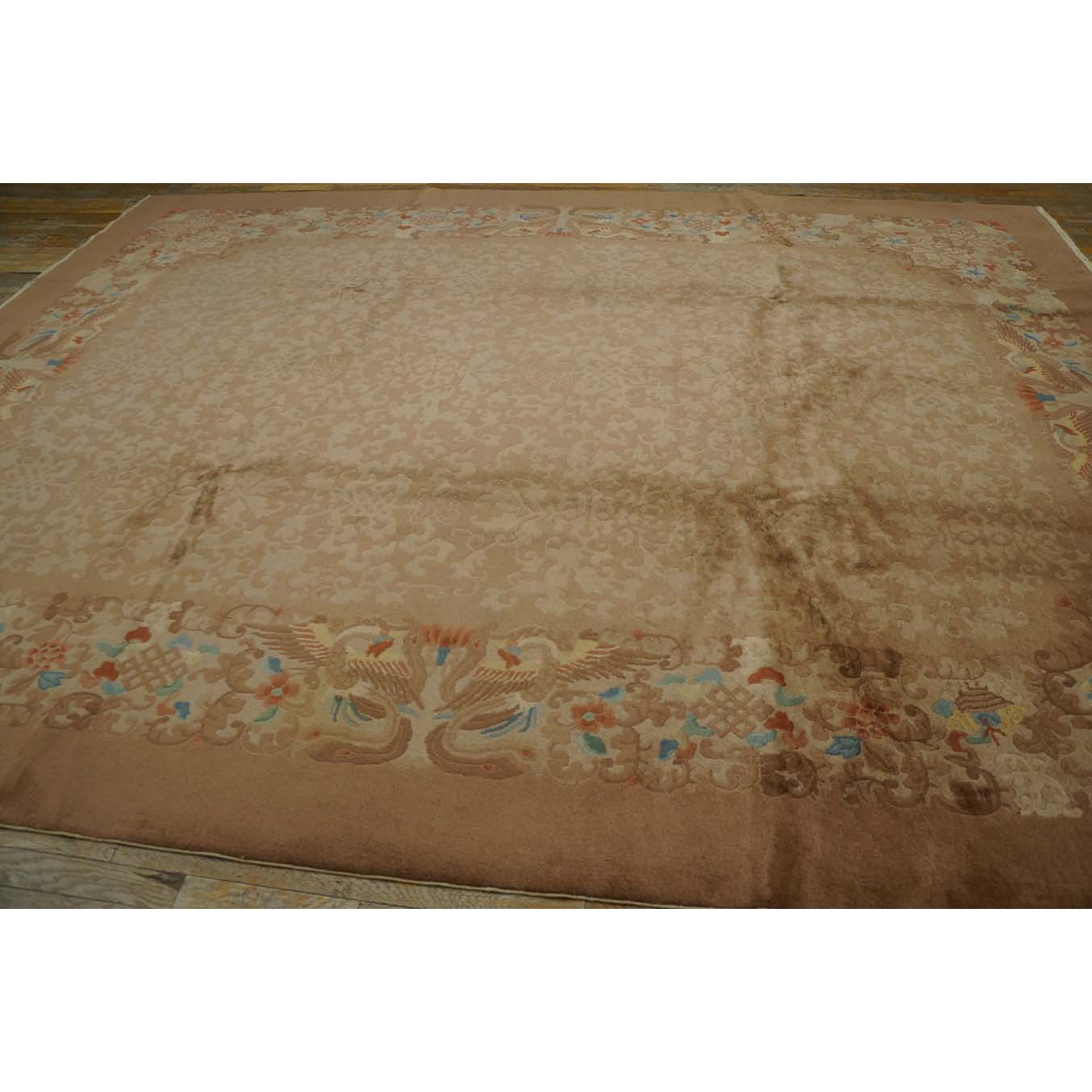DescriptionChineseCarpets made in China proper. See entries Ningshia, Peking, Art Deco. Chinese - Art DecoAs the name implies, pieces woven between the wars for the Western market by mostly American owned firms especially Nichols and Fette, in thick heavy weaves using strong colors, asymmetric patterns and downplaying the Chinese-ness of the carpet. Nichols rugs are more strong toned than the pastel Fette. Most were woven in the coastal port city of Tientsin. Other lesser known workshops were also active. Some pieces are ultra-geometric and haute-Deco moderne in character: these are very rare. More frequent are pieces with bits of Chinese ornament: vases or other precious objects, paeonies, vines, fences, etc. Most common is the 9 x 12 size, in colors never found in mainstream Chinese rugs: backgrounds in black, mauve, purple, hot pink, orange, olive, employing the best synthetic chrome dyes of the period. Prices are still reasonable and carpets in top condition are available. | |