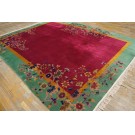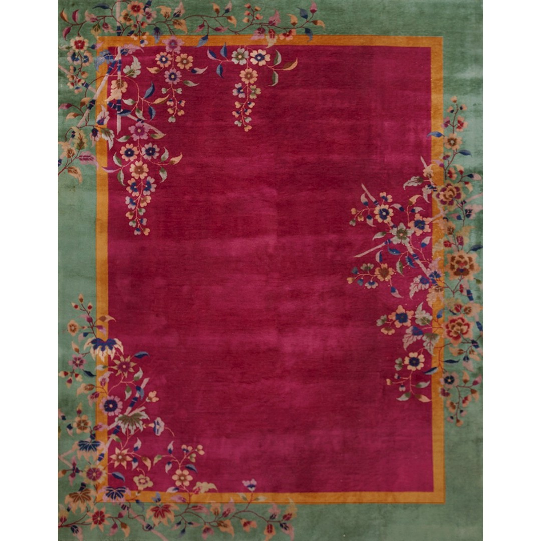 DescriptionChineseCarpets made in China proper. See entries Ningshia, Peking, Art Deco. Chinese - Art DecoAs the name implies, pieces woven between the wars for the Western market by mostly American owned firms especially Nichols and Fette, in thick heavy weaves using strong colors, asymmetric patterns and downplaying the Chinese-ness of the carpet. Nichols rugs are more strong toned than the pastel Fette. Most were woven in the coastal port city of Tientsin. Other lesser known workshops were also active. Some pieces are ultra-geometric and haute-Deco moderne in character: these are very rare. More frequent are pieces with bits of Chinese ornament: vases or other precious objects, paeonies, vines, fences, etc. Most common is the 9 x 12 size, in colors never found in mainstream Chinese rugs: backgrounds in black, mauve, purple, hot pink, orange, olive, employing the best synthetic chrome dyes of the period. Prices are still reasonable and carpets in top condition are available. | |