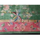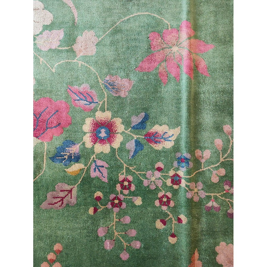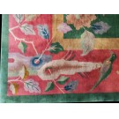 DescriptionChineseCarpets made in China proper. See entries Ningshia, Peking, Art Deco. Chinese - Art DecoAs the name implies, pieces woven between the wars for the Western market by mostly American owned firms especially Nichols and Fette, in thick heavy weaves using strong colors, asymmetric patterns and downplaying the Chinese-ness of the carpet. Nichols rugs are more strong toned than the pastel Fette. Most were woven in the coastal port city of Tientsin. Other lesser known workshops were also active. Some pieces are ultra-geometric and haute-Deco moderne in character: these are very rare. More frequent are pieces with bits of Chinese ornament: vases or other precious objects, paeonies, vines, fences, etc. Most common is the 9 x 12 size, in colors never found in mainstream Chinese rugs: backgrounds in black, mauve, purple, hot pink, orange, olive, employing the best synthetic chrome dyes of the period. Prices are still reasonable and carpets in top condition are available. | |