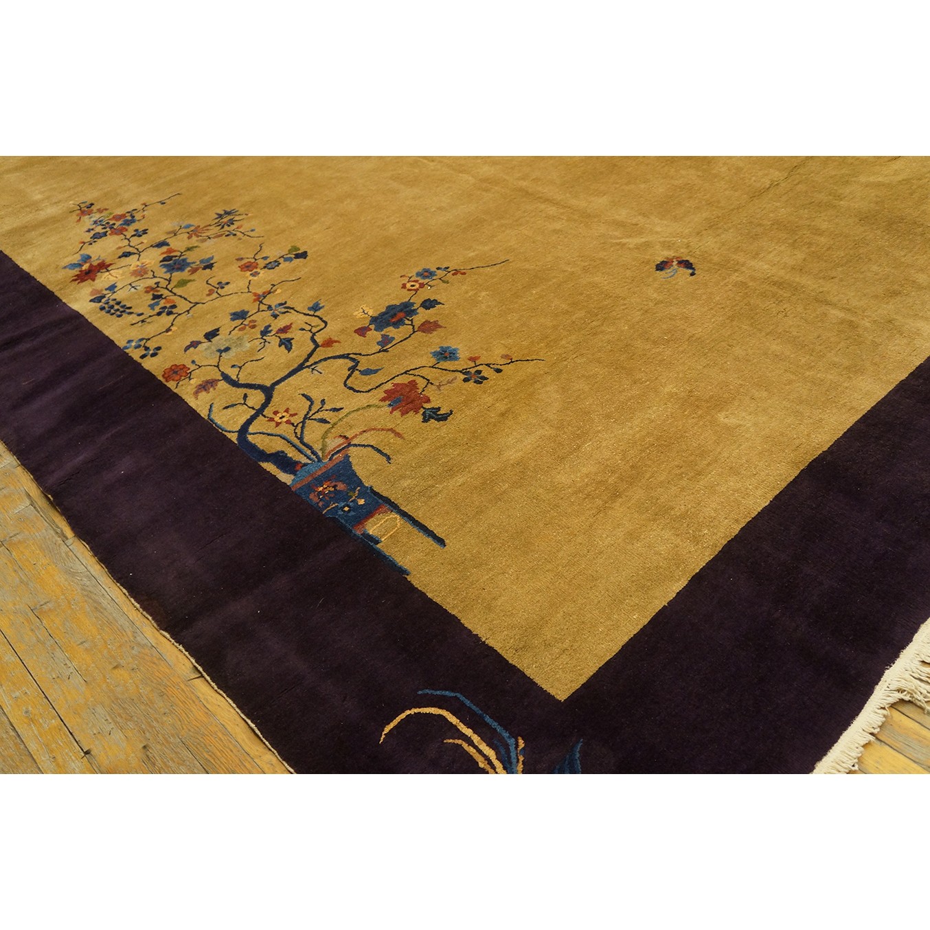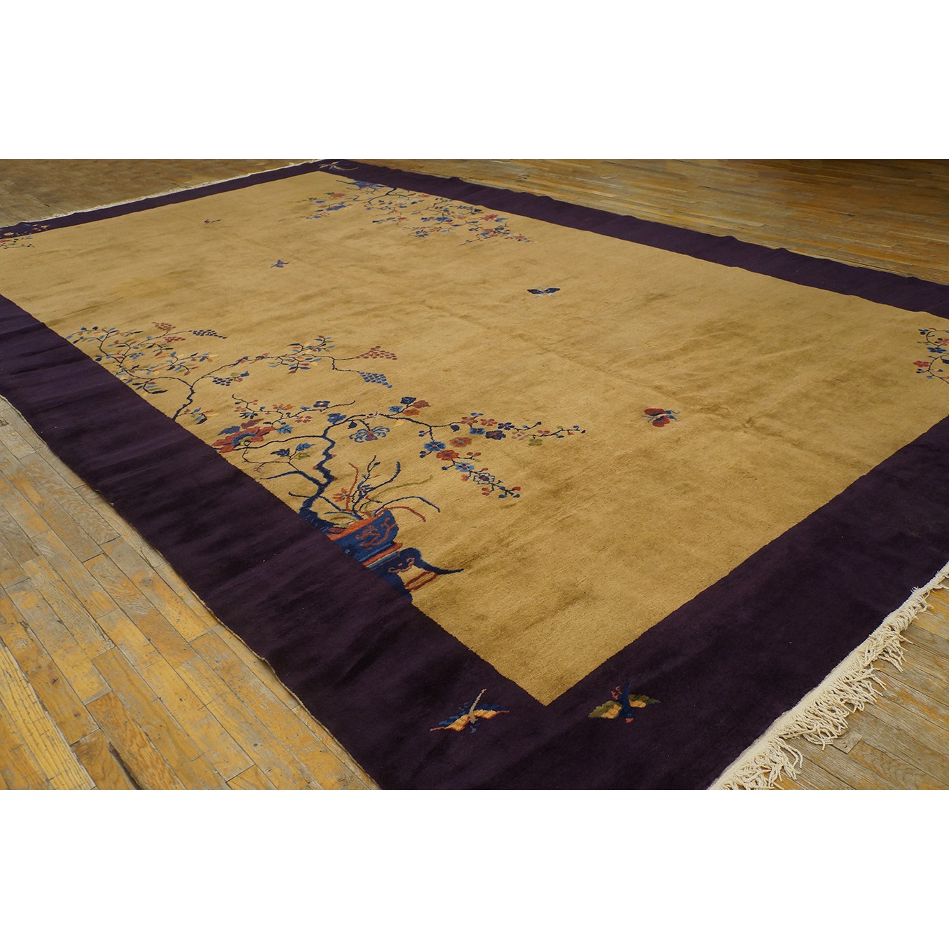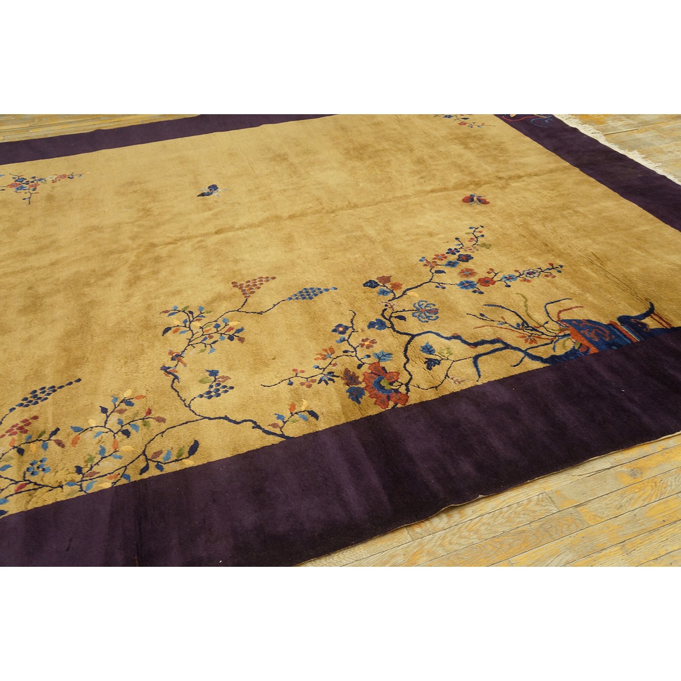 DescriptionChineseCarpets made in China proper. See entries Ningshia, Peking, Art Deco. Chinese - Art DecoAs the name implies, pieces woven between the wars for the Western market by mostly American owned firms especially Nichols and Fette, in thick heavy weaves using strong colors, asymmetric patterns and downplaying the Chinese-ness of the carpet. Nichols rugs are more strong toned than the pastel Fette. Most were woven in the coastal port city of Tientsin. Other lesser known workshops were also active. Some pieces are ultra-geometric and haute-Deco moderne in character: these are very rare. More frequent are pieces with bits of Chinese ornament: vases or other precious objects, paeonies, vines, fences, etc. Most common is the 9 x 12 size, in colors never found in mainstream Chinese rugs: backgrounds in black, mauve, purple, hot pink, orange, olive, employing the best synthetic chrome dyes of the period. Prices are still reasonable and carpets in top condition are available. | |