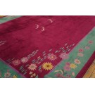DescriptionChineseCarpets made in China proper. See entries Ningshia, Peking, Art Deco. Chinese - Art DecoAs the name implies, pieces woven between the wars for the Western market by mostly American owned firms especially Nichols and Fette, in thick heavy weaves using strong colors, asymmetric patterns and downplaying the Chinese-ness of the carpet. Nichols rugs are more strong toned than the pastel Fette. Most were woven in the coastal port city of Tientsin. Other lesser known workshops were also active. Some pieces are ultra-geometric and haute-Deco moderne in character: these are very rare. More frequent are pieces with bits of Chinese ornament: vases or other precious objects, paeonies, vines, fences, etc. Most common is the 9 x 12 size, in colors never found in mainstream Chinese rugs: backgrounds in black, mauve, purple, hot pink, orange, olive, employing the best synthetic chrome dyes of the period. Prices are still reasonable and carpets in top condition are available. | |