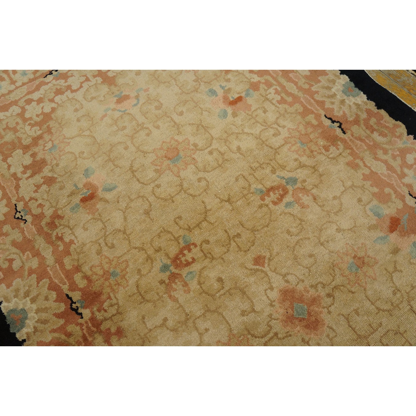 DescriptionChineseCarpets made in China proper. See entries Ningshia, Peking, Art Deco. Chinese - Art DecoAs the name implies, pieces woven between the wars for the Western market by mostly American owned firms especially Nichols and Fette, in thick heavy weaves using strong colors, asymmetric patterns and downplaying the Chinese-ness of the carpet. Nichols rugs are more strong toned than the pastel Fette. Most were woven in the coastal port city of Tientsin. Other lesser known workshops were also active. Some pieces are ultra-geometric and haute-Deco moderne in character: these are very rare. More frequent are pieces with bits of Chinese ornament: vases or other precious objects, paeonies, vines, fences, etc. Most common is the 9 x 12 size, in colors never found in mainstream Chinese rugs: backgrounds in black, mauve, purple, hot pink, orange, olive, employing the best synthetic chrome dyes of the period. Prices are still reasonable and carpets in top condition are available. | |