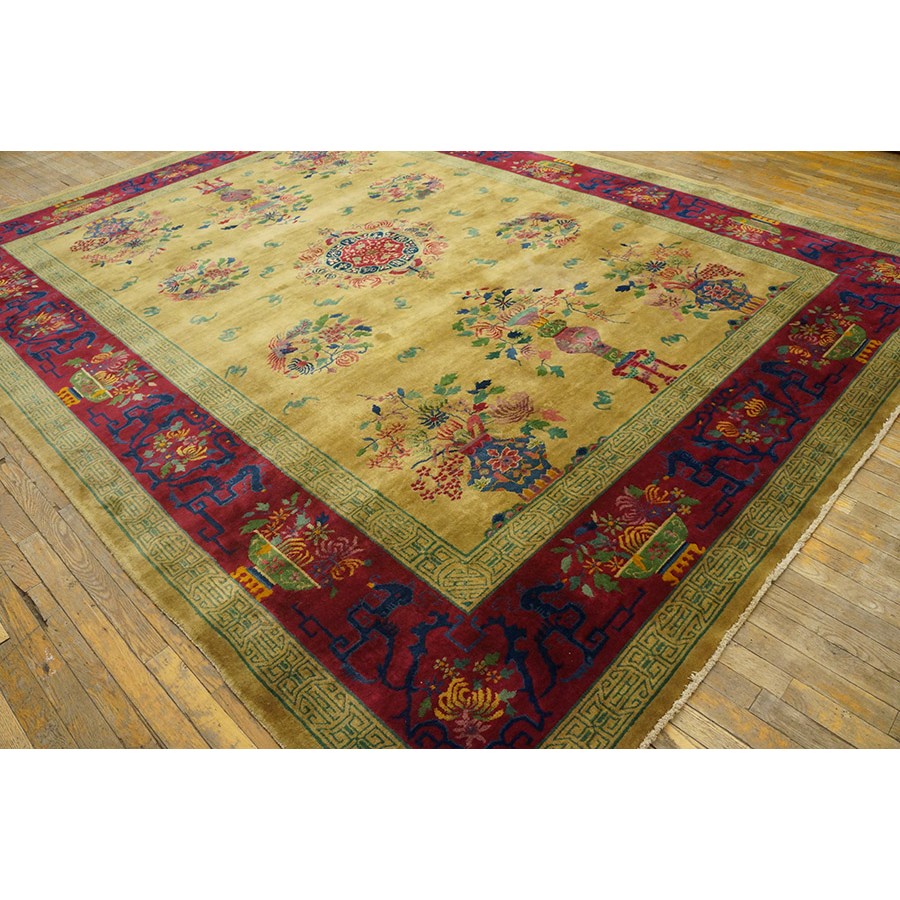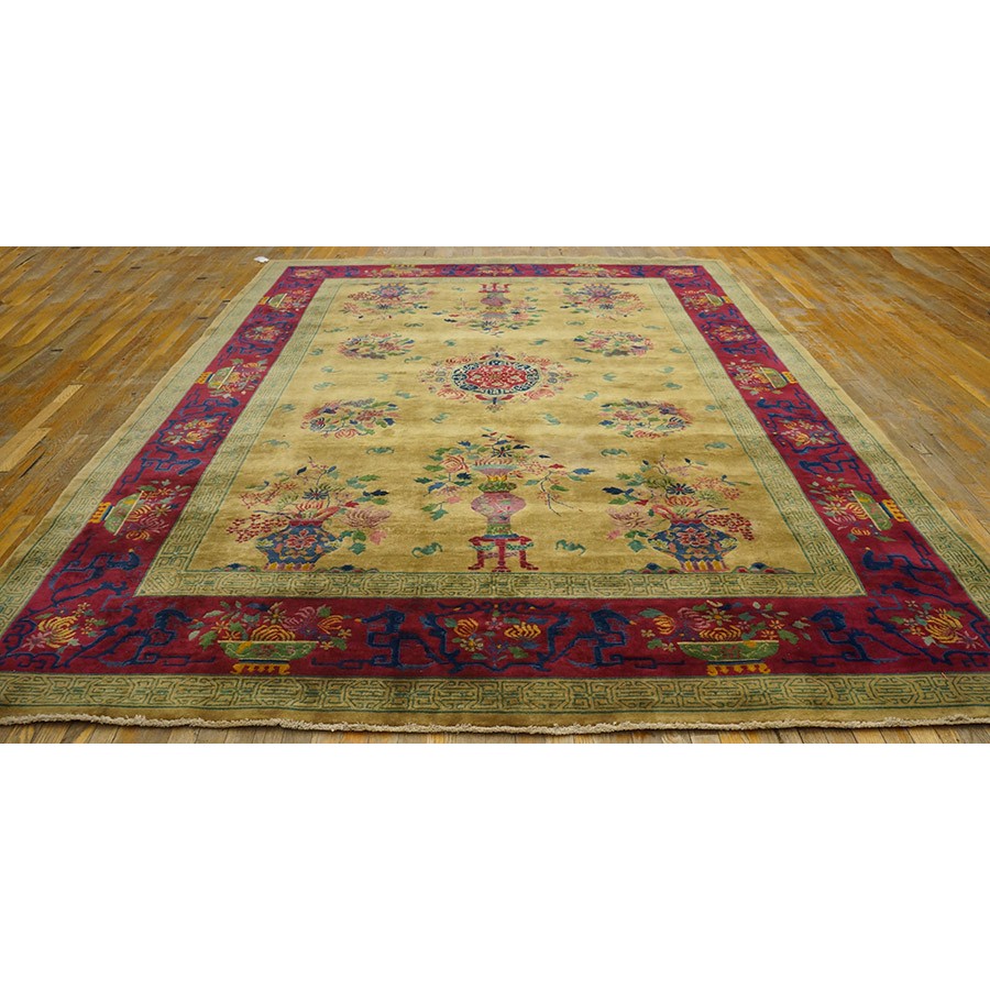 DescriptionChineseCarpets made in China proper. See entries Ningshia, Peking, Art Deco. Chinese - Art DecoAs the name implies, pieces woven between the wars for the Western market by mostly American owned firms especially Nichols and Fette, in thick heavy weaves using strong colors, asymmetric patterns and downplaying the Chinese-ness of the carpet. Nichols rugs are more strong toned than the pastel Fette. Most were woven in the coastal port city of Tientsin. Other lesser known workshops were also active. Some pieces are ultra-geometric and haute-Deco moderne in character: these are very rare. More frequent are pieces with bits of Chinese ornament: vases or other precious objects, paeonies, vines, fences, etc. Most common is the 9 x 12 size, in colors never found in mainstream Chinese rugs: backgrounds in black, mauve, purple, hot pink, orange, olive, employing the best synthetic chrome dyes of the period. Prices are still reasonable and carpets in top condition are available. | |
