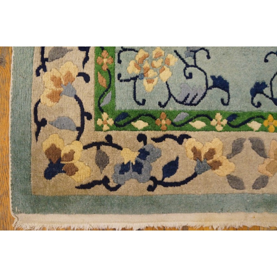 DescriptionChineseCarpets made in China proper. See entries Ningshia, Peking, Art Deco. Chinese - Art DecoAs the name implies, pieces woven between the wars for the Western market by mostly American owned firms especially Nichols and Fette, in thick heavy weaves using strong colors, asymmetric patterns and downplaying the Chinese-ness of the carpet. Nichols rugs are more strong toned than the pastel Fette. Most were woven in the coastal port city of Tientsin. Other lesser known workshops were also active. Some pieces are ultra-geometric and haute-Deco moderne in character: these are very rare. More frequent are pieces with bits of Chinese ornament: vases or other precious objects, paeonies, vines, fences, etc. Most common is the 9 x 12 size, in colors never found in mainstream Chinese rugs: backgrounds in black, mauve, purple, hot pink, orange, olive, employing the best synthetic chrome dyes of the period. Prices are still reasonable and carpets in top condition are available. | |
