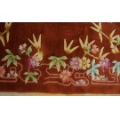 DescriptionChineseCarpets made in China proper. See entries Ningshia, Peking, Art Deco. Chinese - Art DecoAs the name implies, pieces woven between the wars for the Western market by mostly American owned firms especially Nichols and Fette, in thick heavy weaves using strong colors, asymmetric patterns and downplaying the Chinese-ness of the carpet. Nichols rugs are more strong toned than the pastel Fette. Most were woven in the coastal port city of Tientsin. Other lesser known workshops were also active. Some pieces are ultra-geometric and haute-Deco moderne in character: these are very rare. More frequent are pieces with bits of Chinese ornament: vases or other precious objects, paeonies, vines, fences, etc. Most common is the 9 x 12 size, in colors never found in mainstream Chinese rugs: backgrounds in black, mauve, purple, hot pink, orange, olive, employing the best synthetic chrome dyes of the period. Prices are still reasonable and carpets in top condition are available. | |