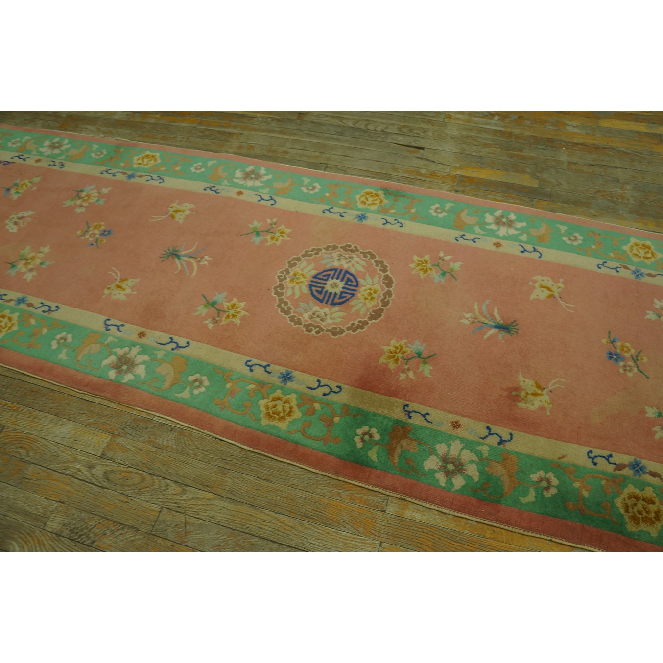 DescriptionChineseCarpets made in China proper. See entries Ningshia, Peking, Art Deco. Chinese - Art DecoAs the name implies, pieces woven between the wars for the Western market by mostly American owned firms especially Nichols and Fette, in thick heavy weaves using strong colors, asymmetric patterns and downplaying the Chinese-ness of the carpet. Nichols rugs are more strong toned than the pastel Fette. Most were woven in the coastal port city of Tientsin. Other lesser known workshops were also active. Some pieces are ultra-geometric and haute-Deco moderne in character: these are very rare. More frequent are pieces with bits of Chinese ornament: vases or other precious objects, paeonies, vines, fences, etc. Most common is the 9 x 12 size, in colors never found in mainstream Chinese rugs: backgrounds in black, mauve, purple, hot pink, orange, olive, employing the best synthetic chrome dyes of the period. Prices are still reasonable and carpets in top condition are available. | |