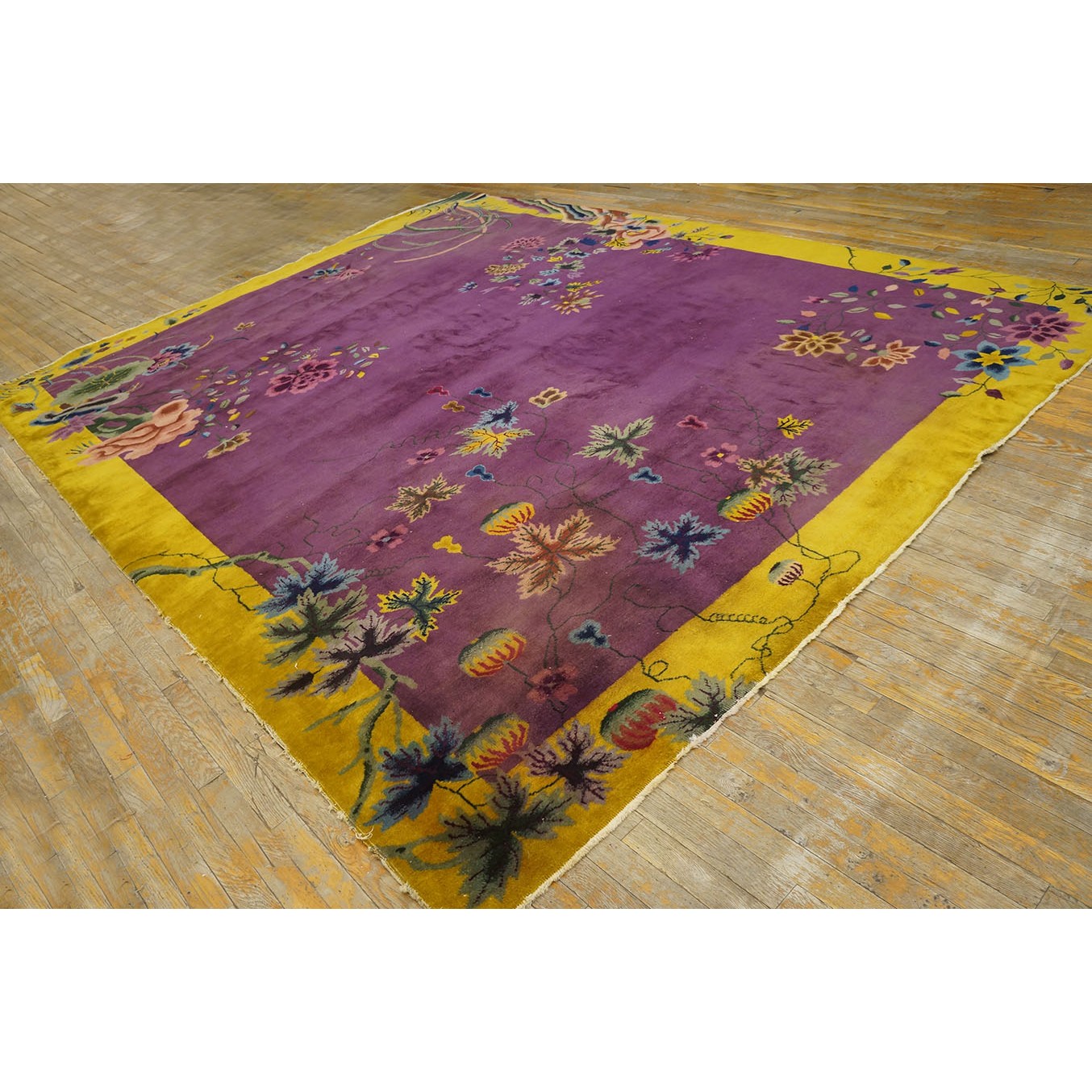 DescriptionChineseCarpets made in China proper. See entries Ningshia, Peking, Art Deco. Chinese - Art DecoAs the name implies, pieces woven between the wars for the Western market by mostly American owned firms especially Nichols and Fette, in thick heavy weaves using strong colors, asymmetric patterns and downplaying the Chinese-ness of the carpet. Nichols rugs are more strong toned than the pastel Fette. Most were woven in the coastal port city of Tientsin. Other lesser known workshops were also active. Some pieces are ultra-geometric and haute-Deco moderne in character: these are very rare. More frequent are pieces with bits of Chinese ornament: vases or other precious objects, paeonies, vines, fences, etc. Most common is the 9 x 12 size, in colors never found in mainstream Chinese rugs: backgrounds in black, mauve, purple, hot pink, orange, olive, employing the best synthetic chrome dyes of the period. Prices are still reasonable and carpets in top condition are available. | |