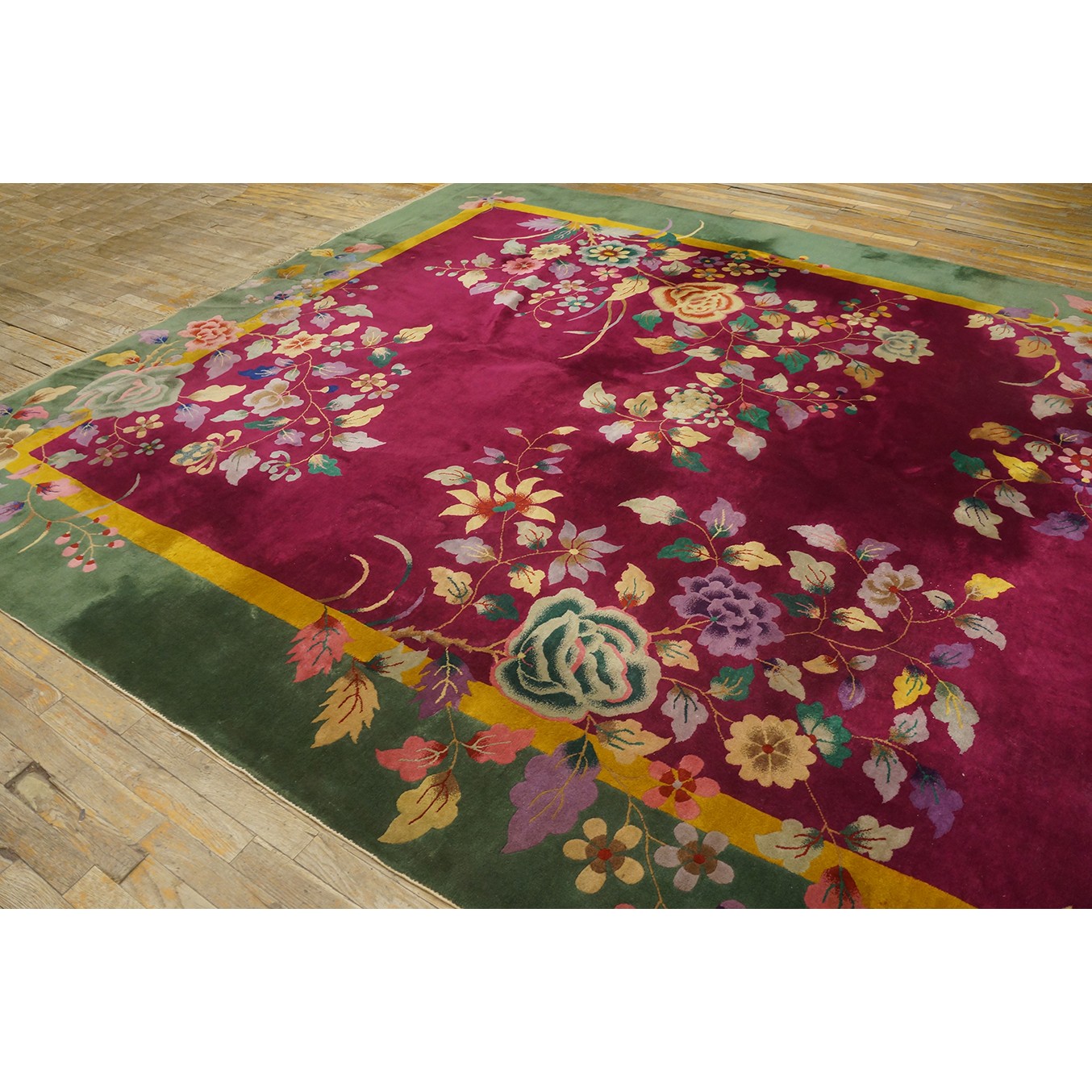 DescriptionChineseCarpets made in China proper. See entries Ningshia, Peking, Art Deco. Chinese - Art DecoAs the name implies, pieces woven between the wars for the Western market by mostly American owned firms especially Nichols and Fette, in thick heavy weaves using strong colors, asymmetric patterns and downplaying the Chinese-ness of the carpet. Nichols rugs are more strong toned than the pastel Fette. Most were woven in the coastal port city of Tientsin. Other lesser known workshops were also active. Some pieces are ultra-geometric and haute-Deco moderne in character: these are very rare. More frequent are pieces with bits of Chinese ornament: vases or other precious objects, paeonies, vines, fences, etc. Most common is the 9 x 12 size, in colors never found in mainstream Chinese rugs: backgrounds in black, mauve, purple, hot pink, orange, olive, employing the best synthetic chrome dyes of the period. Prices are still reasonable and carpets in top condition are available. | |