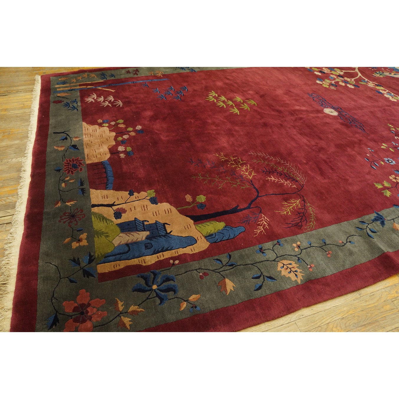 DescriptionChineseCarpets made in China proper. See entries Ningshia, Peking, Art Deco. Chinese - Art DecoAs the name implies, pieces woven between the wars for the Western market by mostly American owned firms especially Nichols and Fette, in thick heavy weaves using strong colors, asymmetric patterns and downplaying the Chinese-ness of the carpet. Nichols rugs are more strong toned than the pastel Fette. Most were woven in the coastal port city of Tientsin. Other lesser known workshops were also active. Some pieces are ultra-geometric and haute-Deco moderne in character: these are very rare. More frequent are pieces with bits of Chinese ornament: vases or other precious objects, paeonies, vines, fences, etc. Most common is the 9 x 12 size, in colors never found in mainstream Chinese rugs: backgrounds in black, mauve, purple, hot pink, orange, olive, employing the best synthetic chrome dyes of the period. Prices are still reasonable and carpets in top condition are available. | |