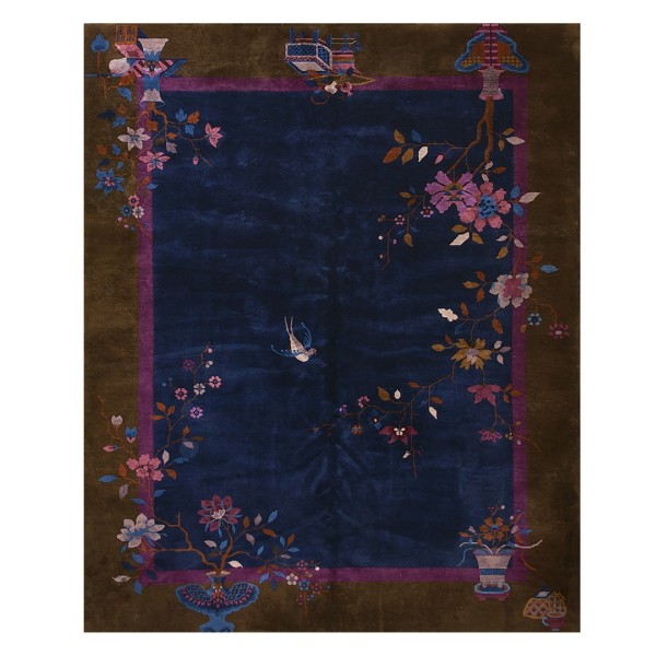DescriptionChineseCarpets made in China proper. See entries Ningshia, Peking, Art Deco. Chinese - Art DecoAs the name implies, pieces woven between the wars for the Western market by mostly American owned firms especially Nichols and Fette, in thick heavy weaves using strong colors, asymmetric patterns and downplaying the Chinese-ness of the carpet. Nichols rugs are more strong toned than the pastel Fette. Most were woven in the coastal port city of Tientsin. Other lesser known workshops were also active. Some pieces are ultra-geometric and haute-Deco moderne in character: these are very rare. More frequent are pieces with bits of Chinese ornament: vases or other precious objects, paeonies, vines, fences, etc. Most common is the 9 x 12 size, in colors never found in mainstream Chinese rugs: backgrounds in black, mauve, purple, hot pink, orange, olive, employing the best synthetic chrome dyes of the period. Prices are still reasonable and carpets in top condition are available. | |