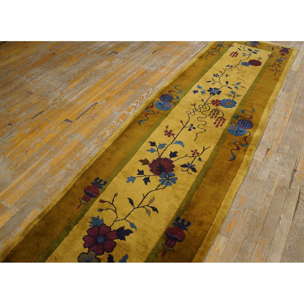 DescriptionChineseCarpets made in China proper. See entries Ningshia, Peking, Art Deco. Chinese - Art DecoAs the name implies, pieces woven between the wars for the Western market by mostly American owned firms especially Nichols and Fette, in thick heavy weaves using strong colors, asymmetric patterns and downplaying the Chinese-ness of the carpet. Nichols rugs are more strong toned than the pastel Fette. Most were woven in the coastal port city of Tientsin. Other lesser known workshops were also active. Some pieces are ultra-geometric and haute-Deco moderne in character: these are very rare. More frequent are pieces with bits of Chinese ornament: vases or other precious objects, paeonies, vines, fences, etc. Most common is the 9 x 12 size, in colors never found in mainstream Chinese rugs: backgrounds in black, mauve, purple, hot pink, orange, olive, employing the best synthetic chrome dyes of the period. Prices are still reasonable and carpets in top condition are available. | |