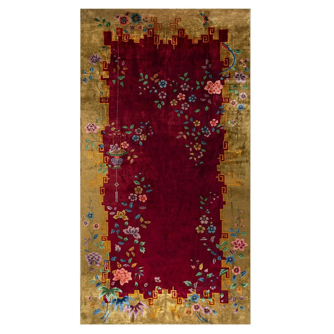 DescriptionChineseCarpets made in China proper. See entries Ningshia, Peking, Art Deco. Chinese - Art DecoAs the name implies, pieces woven between the wars for the Western market by mostly American owned firms especially Nichols and Fette, in thick heavy weaves using strong colors, asymmetric patterns and downplaying the Chinese-ness of the carpet. Nichols rugs are more strong toned than the pastel Fette. Most were woven in the coastal port city of Tientsin. Other lesser known workshops were also active. Some pieces are ultra-geometric and haute-Deco moderne in character: these are very rare. More frequent are pieces with bits of Chinese ornament: vases or other precious objects, paeonies, vines, fences, etc. Most common is the 9 x 12 size, in colors never found in mainstream Chinese rugs: backgrounds in black, mauve, purple, hot pink, orange, olive, employing the best synthetic chrome dyes of the period. Prices are still reasonable and carpets in top condition are available. | |