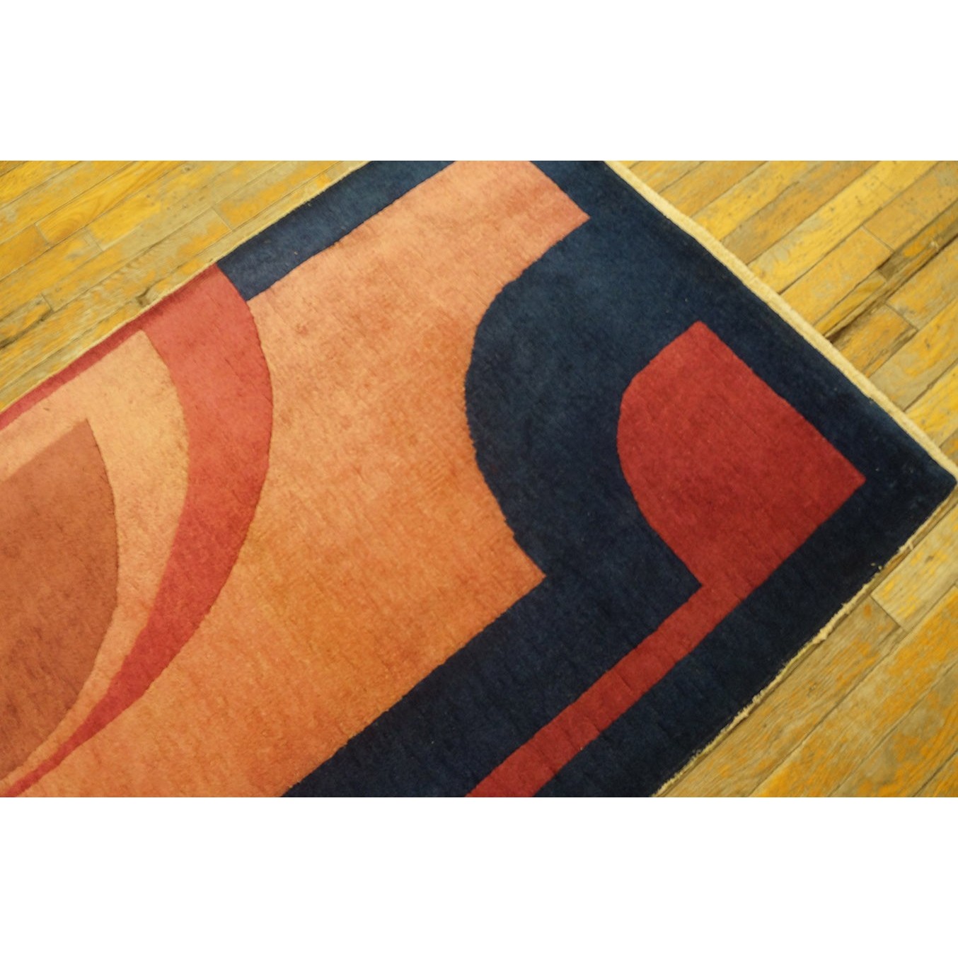DescriptionChineseCarpets made in China proper. See entries Ningshia, Peking, Art Deco. Chinese - Art DecoAs the name implies, pieces woven between the wars for the Western market by mostly American owned firms especially Nichols and Fette, in thick heavy weaves using strong colors, asymmetric patterns and downplaying the Chinese-ness of the carpet. Nichols rugs are more strong toned than the pastel Fette. Most were woven in the coastal port city of Tientsin. Other lesser known workshops were also active. Some pieces are ultra-geometric and haute-Deco moderne in character: these are very rare. More frequent are pieces with bits of Chinese ornament: vases or other precious objects, paeonies, vines, fences, etc. Most common is the 9 x 12 size, in colors never found in mainstream Chinese rugs: backgrounds in black, mauve, purple, hot pink, orange, olive, employing the best synthetic chrome dyes of the period. Prices are still reasonable and carpets in top condition are available. | |