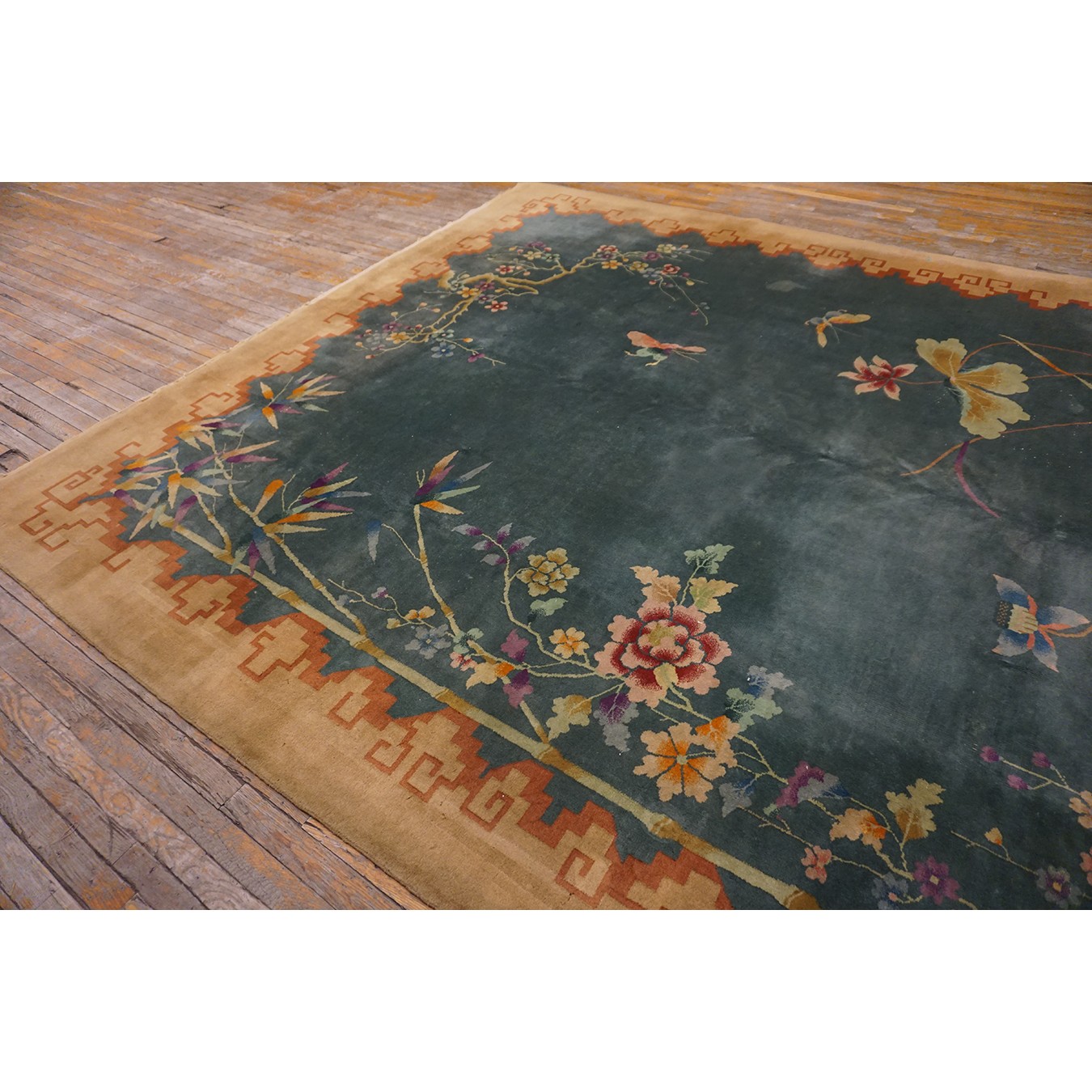 DescriptionChineseCarpets made in China proper. See entries Ningshia, Peking, Art Deco. Chinese - Art DecoAs the name implies, pieces woven between the wars for the Western market by mostly American owned firms especially Nichols and Fette, in thick heavy weaves using strong colors, asymmetric patterns and downplaying the Chinese-ness of the carpet. Nichols rugs are more strong toned than the pastel Fette. Most were woven in the coastal port city of Tientsin. Other lesser known workshops were also active. Some pieces are ultra-geometric and haute-Deco moderne in character: these are very rare. More frequent are pieces with bits of Chinese ornament: vases or other precious objects, paeonies, vines, fences, etc. Most common is the 9 x 12 size, in colors never found in mainstream Chinese rugs: backgrounds in black, mauve, purple, hot pink, orange, olive, employing the best synthetic chrome dyes of the period. Prices are still reasonable and carpets in top condition are available. | |
