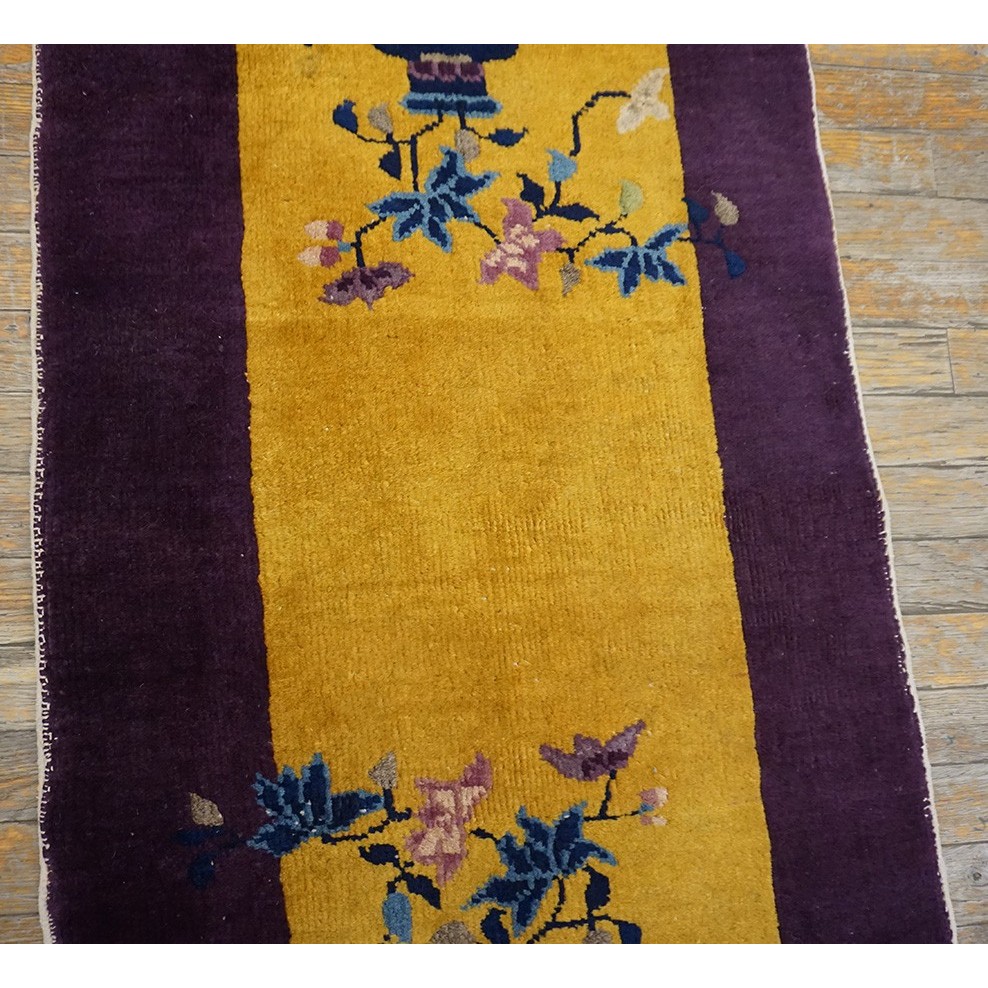 DescriptionChineseCarpets made in China proper. See entries Ningshia, Peking, Art Deco. Chinese - Art DecoAs the name implies, pieces woven between the wars for the Western market by mostly American owned firms especially Nichols and Fette, in thick heavy weaves using strong colors, asymmetric patterns and downplaying the Chinese-ness of the carpet. Nichols rugs are more strong toned than the pastel Fette. Most were woven in the coastal port city of Tientsin. Other lesser known workshops were also active. Some pieces are ultra-geometric and haute-Deco moderne in character: these are very rare. More frequent are pieces with bits of Chinese ornament: vases or other precious objects, paeonies, vines, fences, etc. Most common is the 9 x 12 size, in colors never found in mainstream Chinese rugs: backgrounds in black, mauve, purple, hot pink, orange, olive, employing the best synthetic chrome dyes of the period. Prices are still reasonable and carpets in top condition are available. | |
