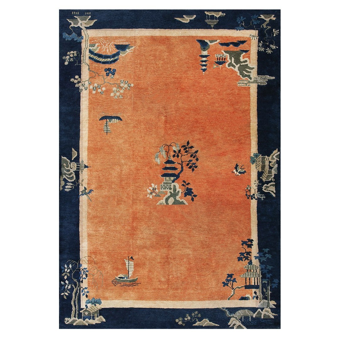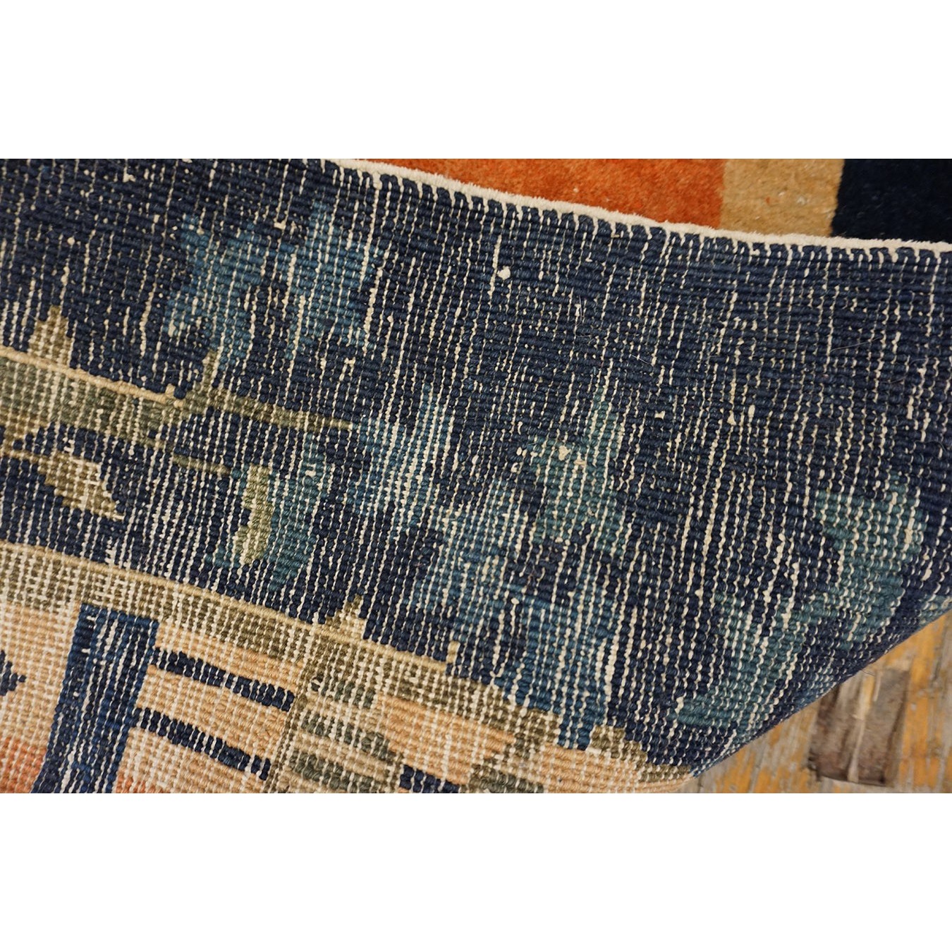 DescriptionChineseCarpets made in China proper. See entries Ningshia, Peking, Art Deco. Chinese - Art DecoAs the name implies, pieces woven between the wars for the Western market by mostly American owned firms especially Nichols and Fette, in thick heavy weaves using strong colors, asymmetric patterns and downplaying the Chinese-ness of the carpet. Nichols rugs are more strong toned than the pastel Fette. Most were woven in the coastal port city of Tientsin. Other lesser known workshops were also active. Some pieces are ultra-geometric and haute-Deco moderne in character: these are very rare. More frequent are pieces with bits of Chinese ornament: vases or other precious objects, paeonies, vines, fences, etc. Most common is the 9 x 12 size, in colors never found in mainstream Chinese rugs: backgrounds in black, mauve, purple, hot pink, orange, olive, employing the best synthetic chrome dyes of the period. Prices are still reasonable and carpets in top condition are available. | |