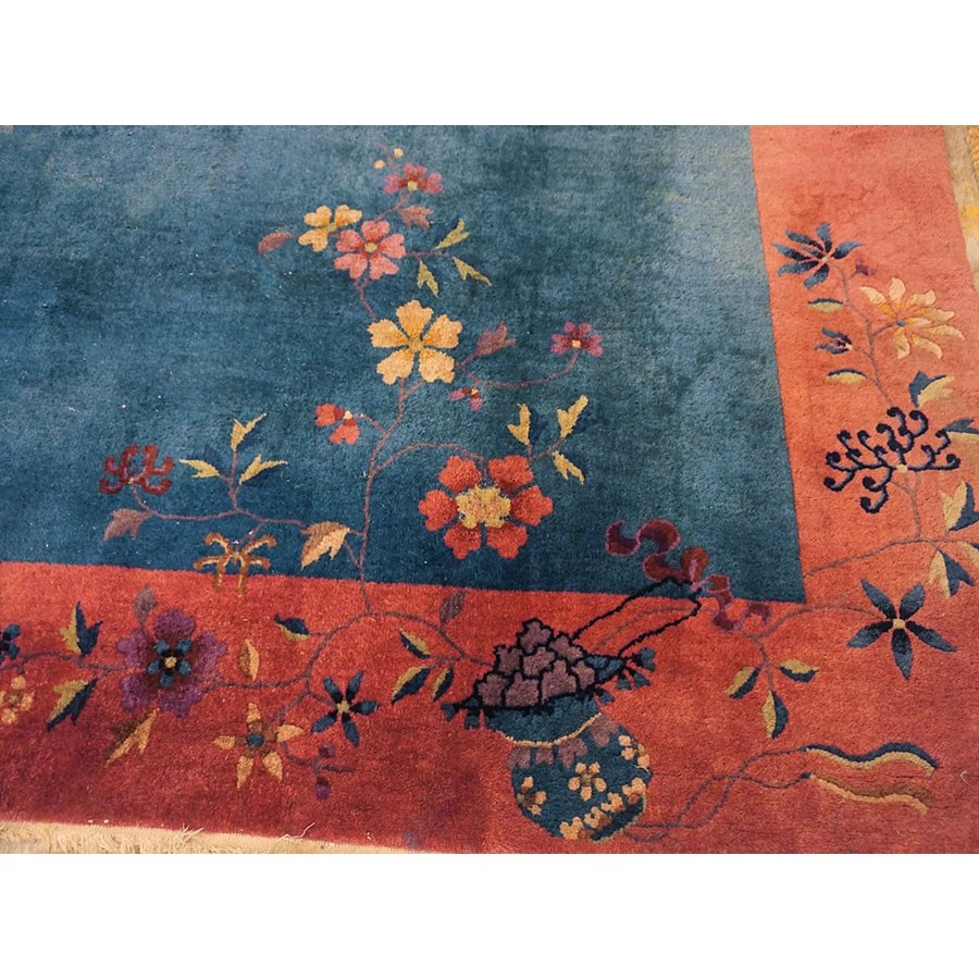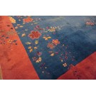 DescriptionChineseCarpets made in China proper. See entries Ningshia, Peking, Art Deco. Chinese - Art DecoAs the name implies, pieces woven between the wars for the Western market by mostly American owned firms especially Nichols and Fette, in thick heavy weaves using strong colors, asymmetric patterns and downplaying the Chinese-ness of the carpet. Nichols rugs are more strong toned than the pastel Fette. Most were woven in the coastal port city of Tientsin. Other lesser known workshops were also active. Some pieces are ultra-geometric and haute-Deco moderne in character: these are very rare. More frequent are pieces with bits of Chinese ornament: vases or other precious objects, paeonies, vines, fences, etc. Most common is the 9 x 12 size, in colors never found in mainstream Chinese rugs: backgrounds in black, mauve, purple, hot pink, orange, olive, employing the best synthetic chrome dyes of the period. Prices are still reasonable and carpets in top condition are available. | |