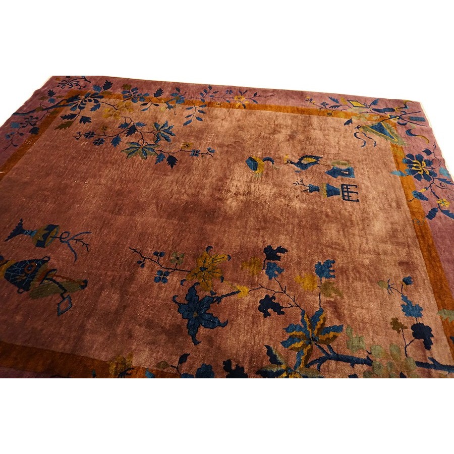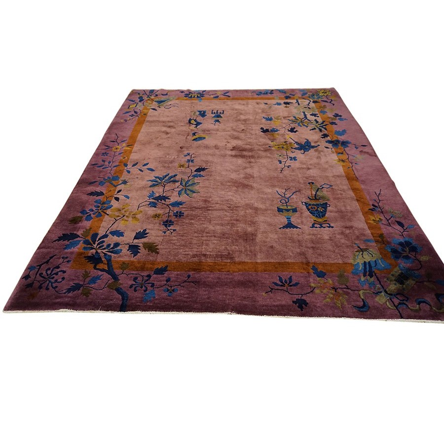 DescriptionChineseCarpets made in China proper. See entries Ningshia, Peking, Art Deco. Chinese - Art DecoAs the name implies, pieces woven between the wars for the Western market by mostly American owned firms especially Nichols and Fette, in thick heavy weaves using strong colors, asymmetric patterns and downplaying the Chinese-ness of the carpet. Nichols rugs are more strong toned than the pastel Fette. Most were woven in the coastal port city of Tientsin. Other lesser known workshops were also active. Some pieces are ultra-geometric and haute-Deco moderne in character: these are very rare. More frequent are pieces with bits of Chinese ornament: vases or other precious objects, paeonies, vines, fences, etc. Most common is the 9 x 12 size, in colors never found in mainstream Chinese rugs: backgrounds in black, mauve, purple, hot pink, orange, olive, employing the best synthetic chrome dyes of the period. Prices are still reasonable and carpets in top condition are available. | |