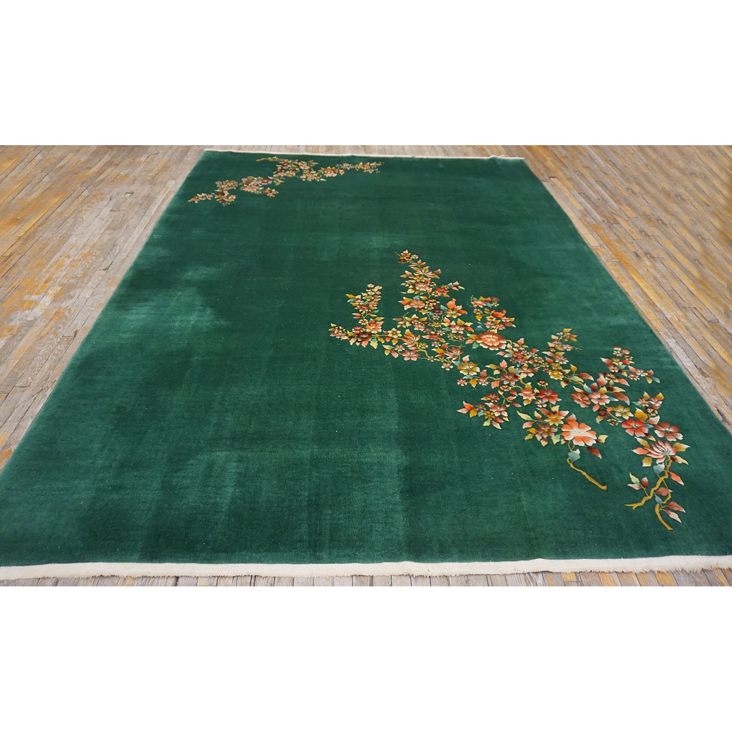 DescriptionChineseCarpets made in China proper. See entries Ningshia, Peking, Art Deco. Chinese - Art DecoAs the name implies, pieces woven between the wars for the Western market by mostly American owned firms especially Nichols and Fette, in thick heavy weaves using strong colors, asymmetric patterns and downplaying the Chinese-ness of the carpet. Nichols rugs are more strong toned than the pastel Fette. Most were woven in the coastal port city of Tientsin. Other lesser known workshops were also active. Some pieces are ultra-geometric and haute-Deco moderne in character: these are very rare. More frequent are pieces with bits of Chinese ornament: vases or other precious objects, paeonies, vines, fences, etc. Most common is the 9 x 12 size, in colors never found in mainstream Chinese rugs: backgrounds in black, mauve, purple, hot pink, orange, olive, employing the best synthetic chrome dyes of the period. Prices are still reasonable and carpets in top condition are available. | |