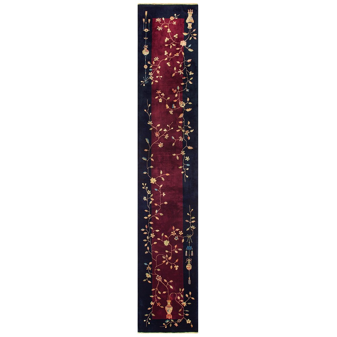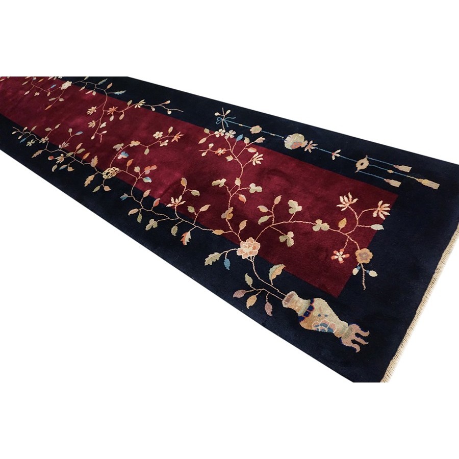 DescriptionChineseCarpets made in China proper. See entries Ningshia, Peking, Art Deco. Chinese - Art DecoAs the name implies, pieces woven between the wars for the Western market by mostly American owned firms especially Nichols and Fette, in thick heavy weaves using strong colors, asymmetric patterns and downplaying the Chinese-ness of the carpet. Nichols rugs are more strong toned than the pastel Fette. Most were woven in the coastal port city of Tientsin. Other lesser known workshops were also active. Some pieces are ultra-geometric and haute-Deco moderne in character: these are very rare. More frequent are pieces with bits of Chinese ornament: vases or other precious objects, paeonies, vines, fences, etc. Most common is the 9 x 12 size, in colors never found in mainstream Chinese rugs: backgrounds in black, mauve, purple, hot pink, orange, olive, employing the best synthetic chrome dyes of the period. Prices are still reasonable and carpets in top condition are available. | |