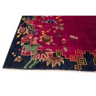 DescriptionChineseCarpets made in China proper. See entries Ningshia, Peking, Art Deco. Chinese - Art DecoAs the name implies, pieces woven between the wars for the Western market by mostly American owned firms especially Nichols and Fette, in thick heavy weaves using strong colors, asymmetric patterns and downplaying the Chinese-ness of the carpet. Nichols rugs are more strong toned than the pastel Fette. Most were woven in the coastal port city of Tientsin. Other lesser known workshops were also active. Some pieces are ultra-geometric and haute-Deco moderne in character: these are very rare. More frequent are pieces with bits of Chinese ornament: vases or other precious objects, paeonies, vines, fences, etc. Most common is the 9 x 12 size, in colors never found in mainstream Chinese rugs: backgrounds in black, mauve, purple, hot pink, orange, olive, employing the best synthetic chrome dyes of the period. Prices are still reasonable and carpets in top condition are available. | |